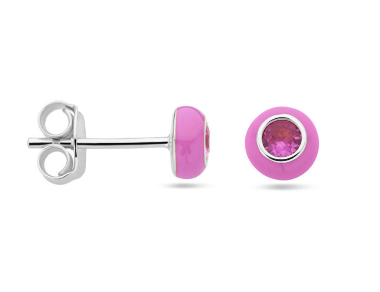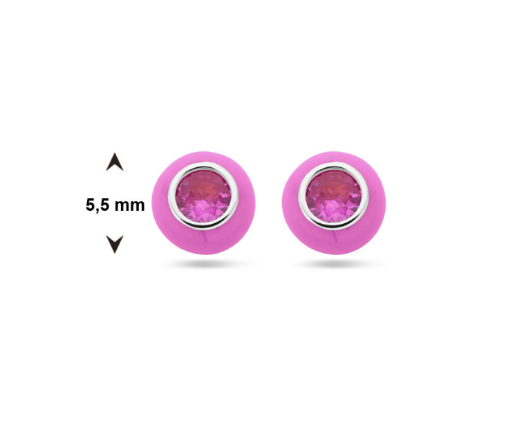 Gerhodineerd 925 zilveren oorknoppen uitgevoerd met roze emaille en corundum zirkonia. De oorknoppen hebben een diameter van 5,5mm.
