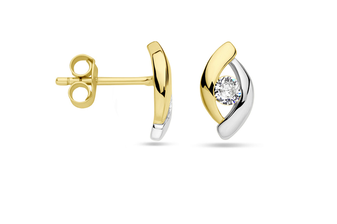 925 Zilveren oorstekers, deels gerhodineerd en deels met 1 micron geelgoud plating. De oorstekers zijn uitgevoerd met zirkonia. Geen garantie op plating.