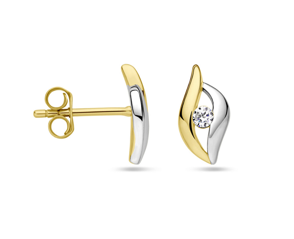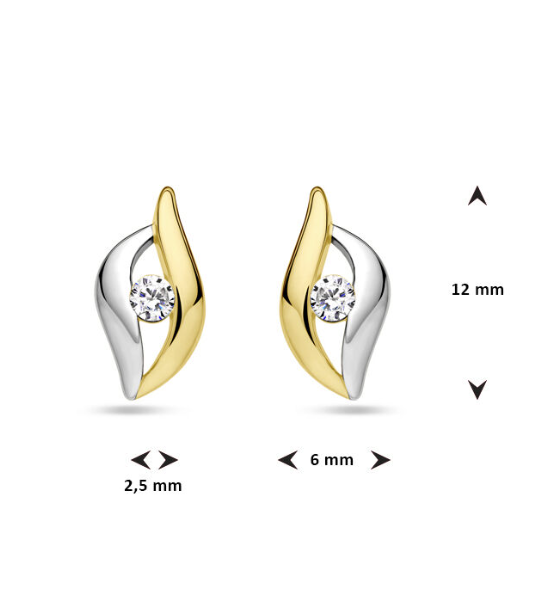 925 Zilveren oorstekers, deels gerhodineerd en deels met 1 micron geelgoud plating. De oorstekers zijn uitgevoerd met zirkonia. Geen garantie op plating.