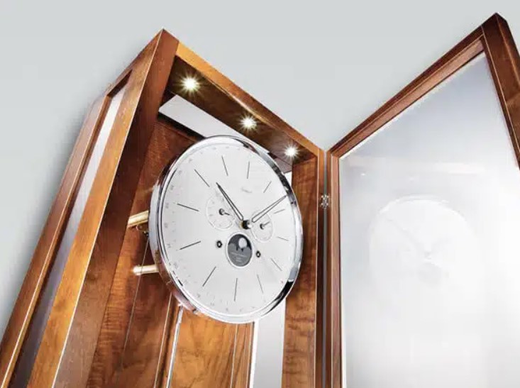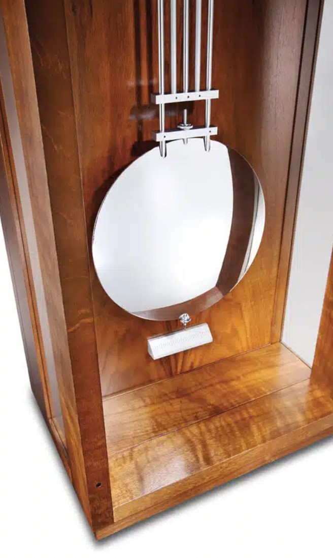 Moderne strak gelijnde staande klok in Notenhouten kast met LED verlichting en speciaal gebouwd GSE01 Kabel uurwerk. Bim Bam slagwerk op de hele en de halve uren op in een geheim vak gemonteerde gongstaven. Geanodiseerde wijzerplaat met maanstand, datum week en maand aanduiding. Extra lange Compensatie slinger voor een zeer rustige tik.