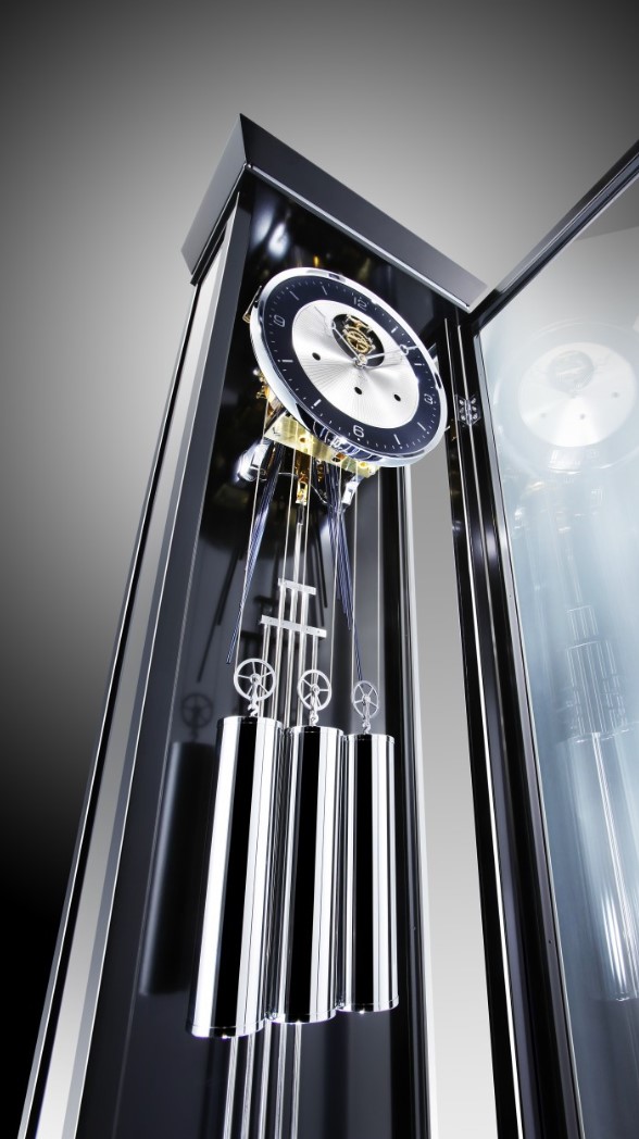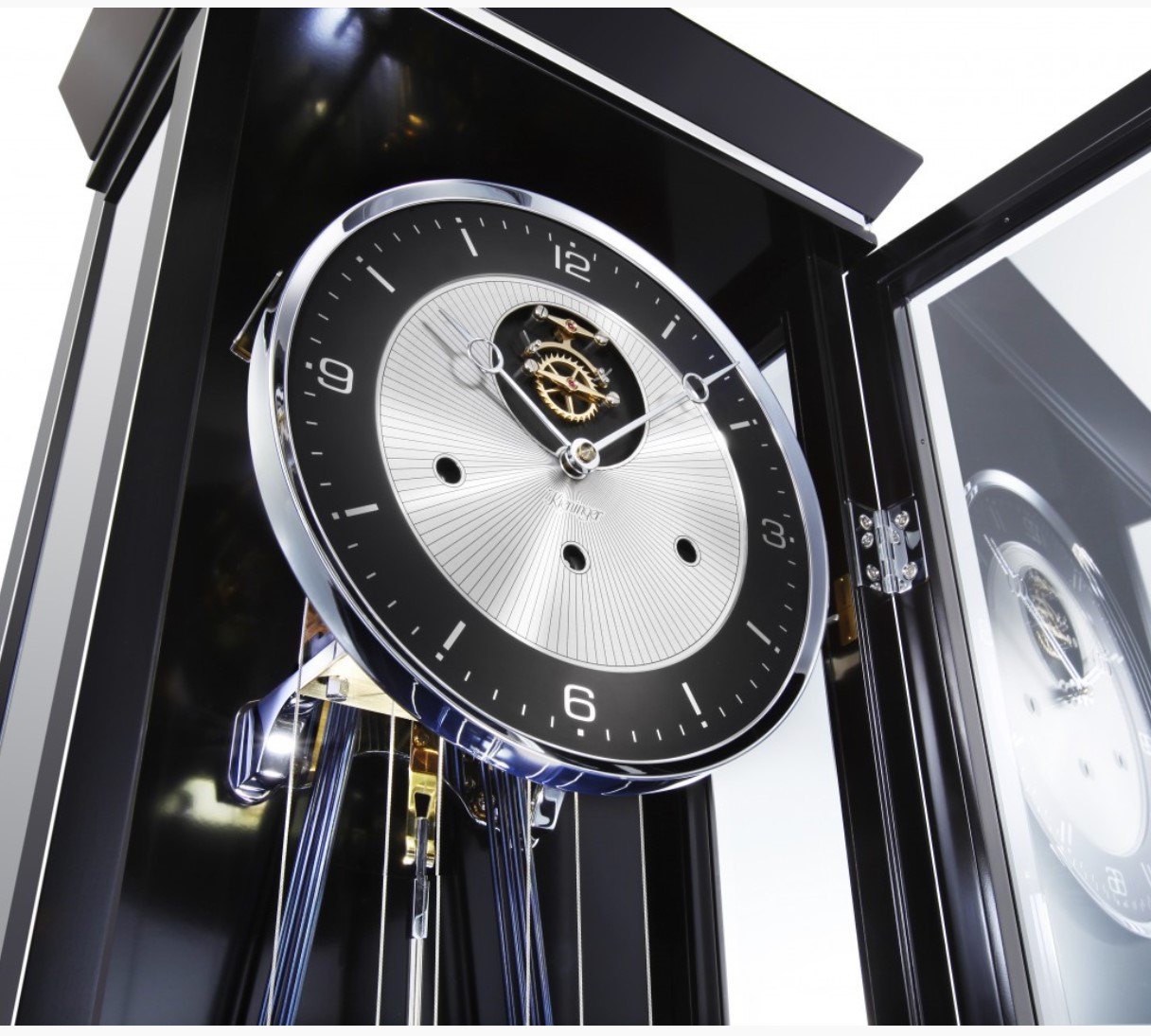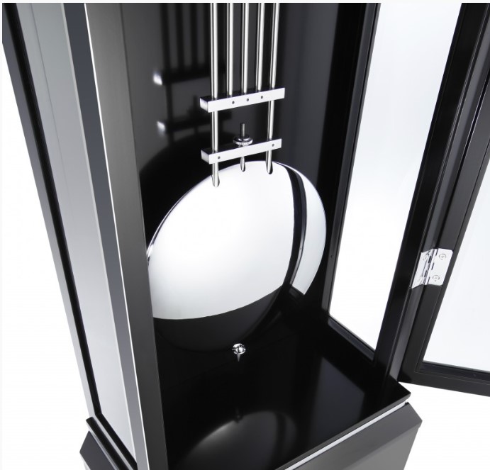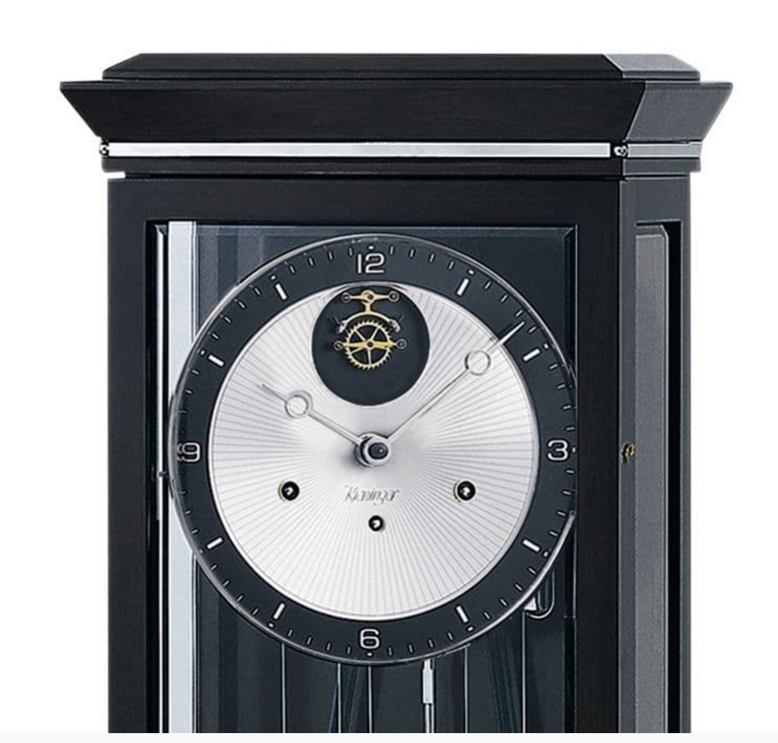 Luxe Kieninger staande klok zwart gelakt met metaal inleg. 190 cm hoog, 38,5 cm breed en 19,5 cm diep. Uurwerk Kieninger RS007 met Westminster slagwerk. Wijzerplaat, slinger en gewicht set in Nickel. Wijzerplaat met doorkijk op het Graham-Anker met keramische paletten. Uitgevoerd met een Compensatie slinger.