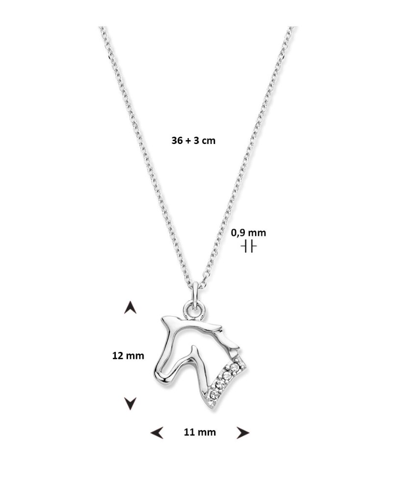 Gerhodineerd 925 zilveren collier uitgevoerd met een hanger in de vorm van een paard. Het collier heeft een draaglengte van 36cm met een extensie van 3cm en een stevige karabijn sluiting. De hanger heeft een afmeting van 12x11mm. De schakelbreedte is 0.9mm.