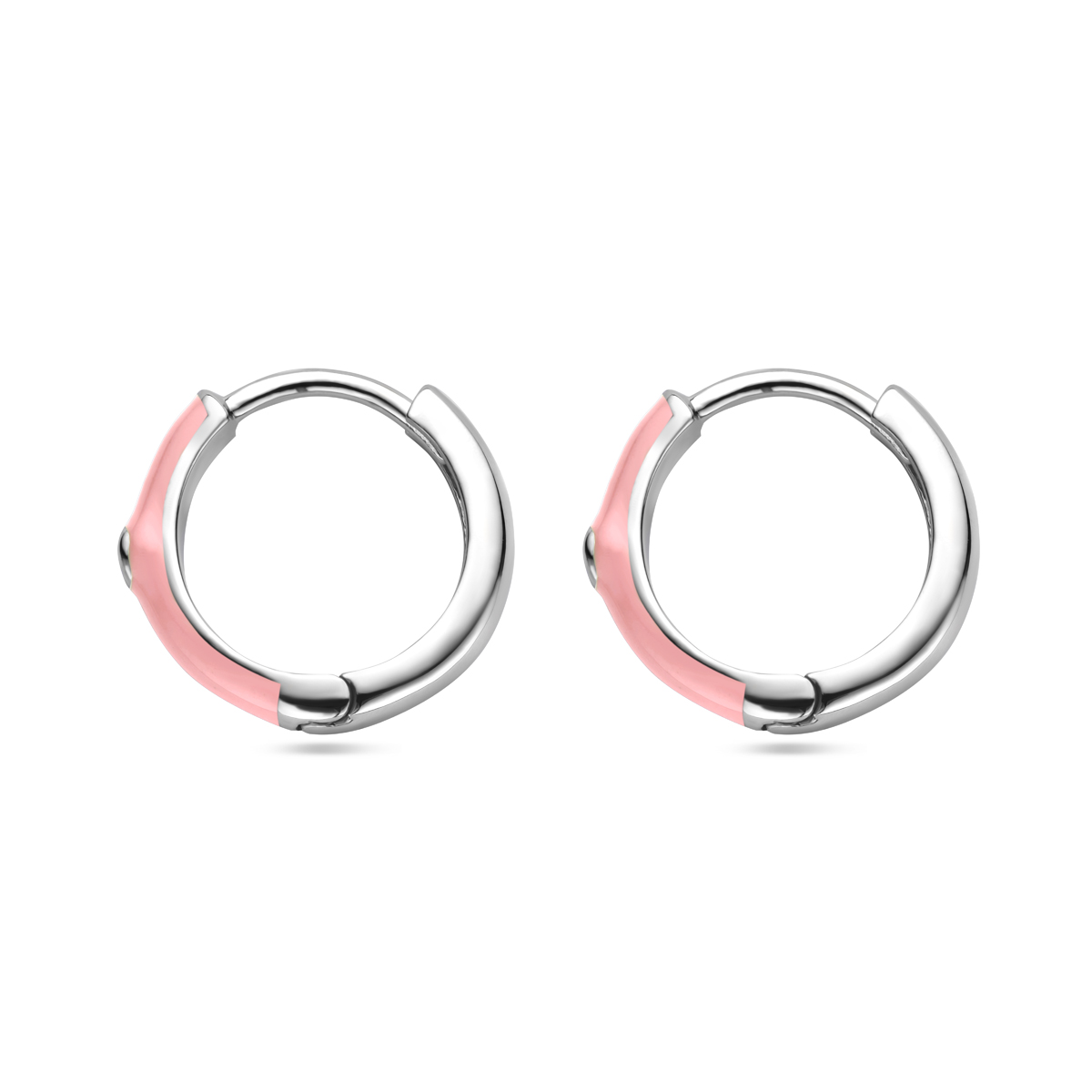 Gerhodineerd 925 zilveren klapoorringen uitgevoerd met zirkonia en roze emaille. De klapoorringen hebben een afmeting van 15x2.5mm.