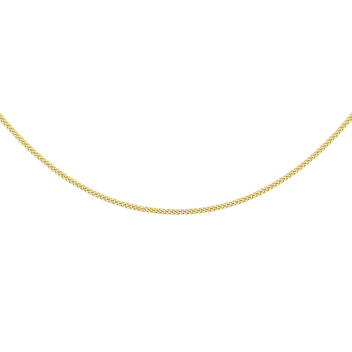 Geelgoud op 925 zilveren gourmette collier met een schakelbreedte van 1.2mm. Het collier heeft een draaglengte van 41cm en een extensie van 4cm. Geen garantie op plating.