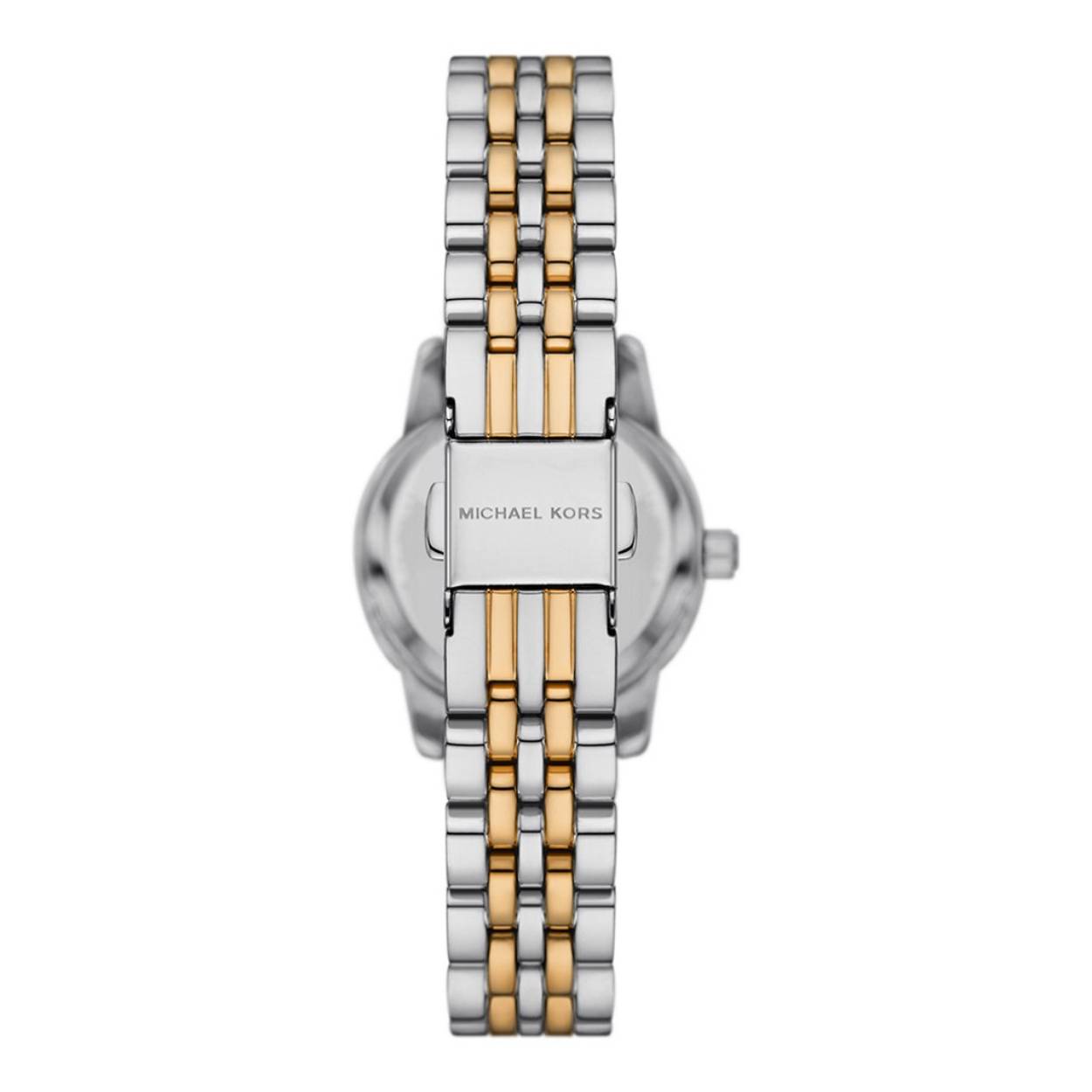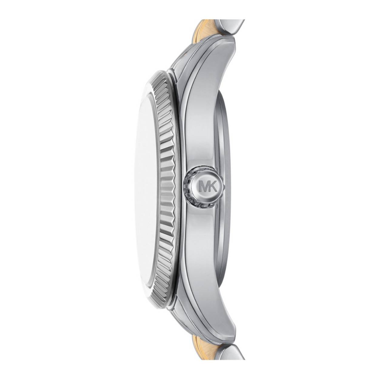 Dit Michael Kors Lexington horloge van 26mm heeft een glanzende marineblauwe parelmoeren wijzerplaat, uurwerk met drie wijzers en een tweekleurige roestvrijstalen armband.