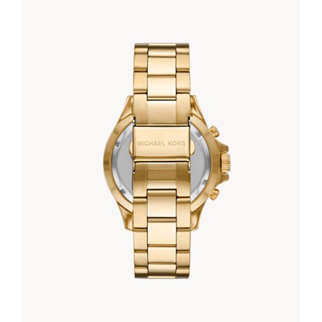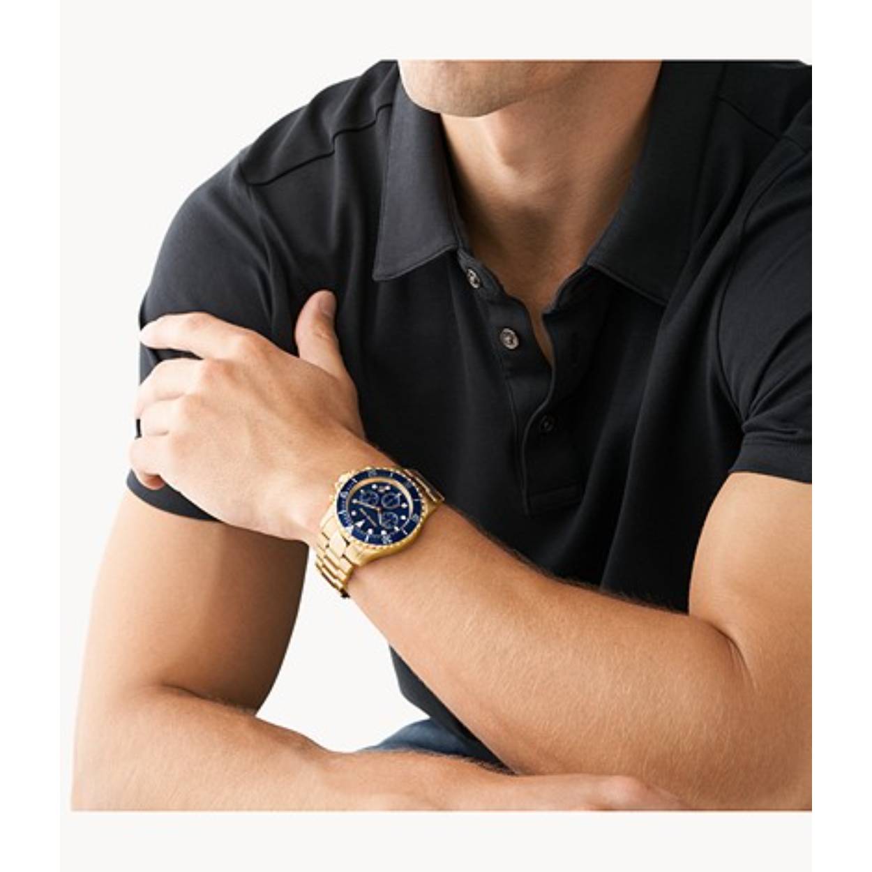 Stoere goudkleurige Michael Kors horloge, uit de Everest collectie. De wijzerplaat is marine blauw metwitte indexen en wijzers. Het horloge heefteen stopwatch functie en is 10atm waterdicht.