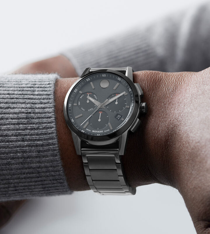 Movado Museum Sport Chronograph, 43 mm gunmetal PVD-finished stainless steel horlogekast met zwarte PVD-finished Lunette. Zwarte wijzerplaat met chronograaf en datumweergave. Gunmetal PVD-finished horlogeband.