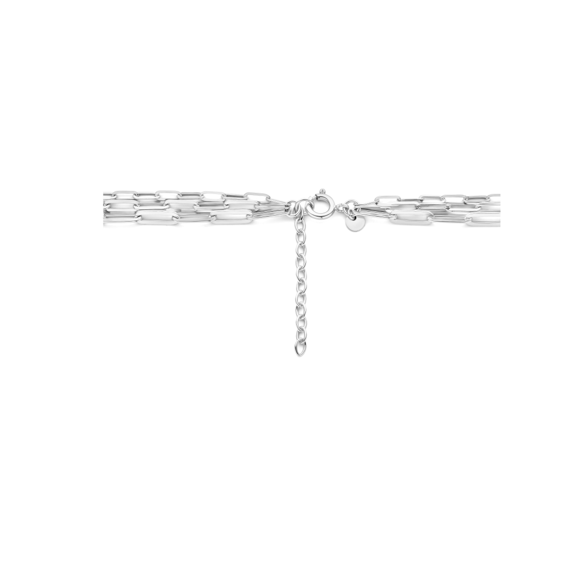 Gerhodineerd 925 zilveren collier uitgevoerd met 3 paperclip schakels van: 2.8, 3.3 en 4mm. Het collier heeft een draaglengte van 41cm en een extensie van 4cm.