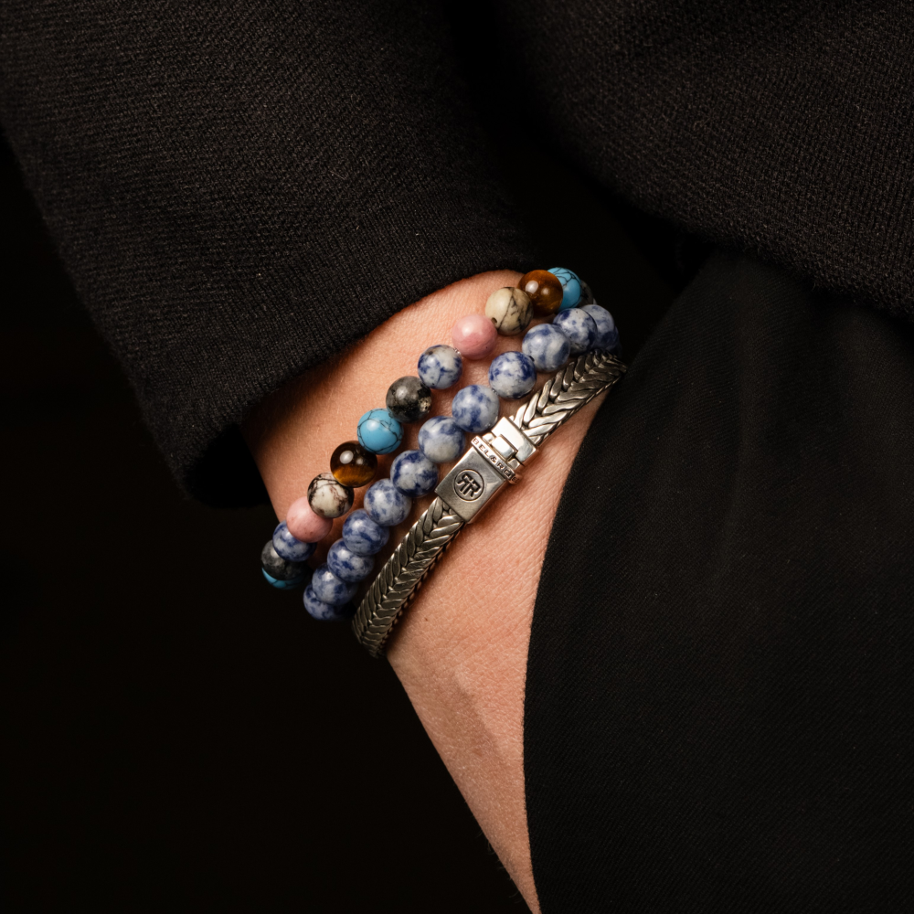 Bead armband, handgemaakt van 8mm stenen ( Tijgeroog, Black Network, Lignify Rodocrosh, Blue Spot Stone, Larvakiet, Turquoise) met een zilverkleurige sluiting. De Rebel & Rose sieraden zijn makkelijk te combineren met andere zilveren, leren of kralenarmbanden.