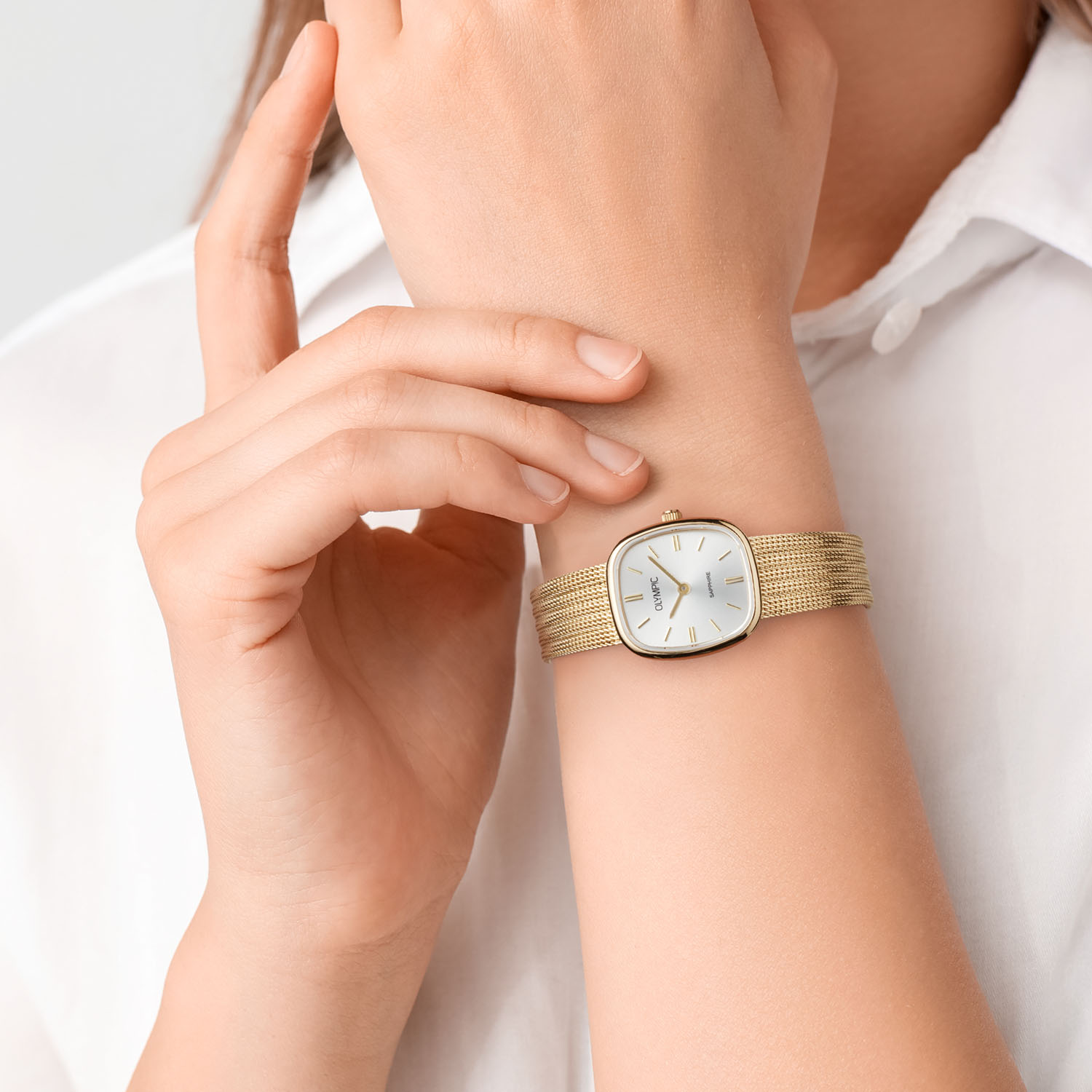 Dit is een dameshorloge met een classic chique uitstraling. Het horloge heeft een rechte stalen goudkleurige kast met een zilverkleurige sunray wijzerplaat en fijne uursaanduiding. Direct aan de kast zit een goudkleurige milanese band. Het horloge heeft een saffierglas, een afmeting van 23x25mm en is 3ATM.
