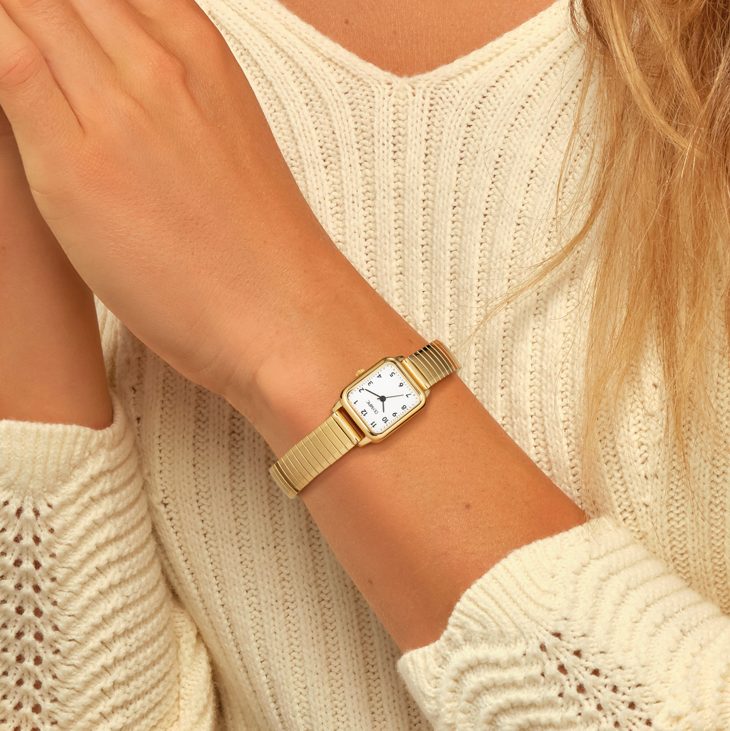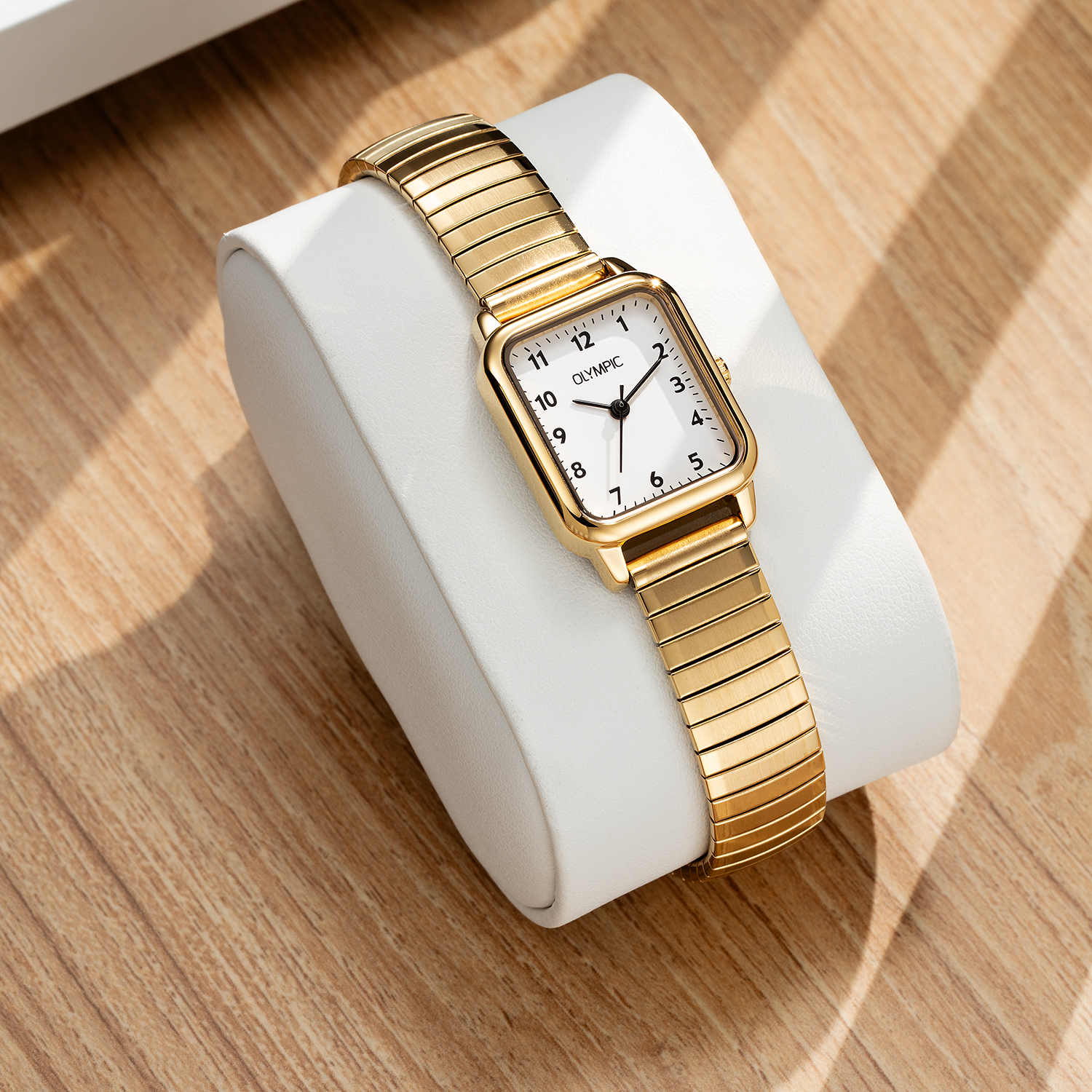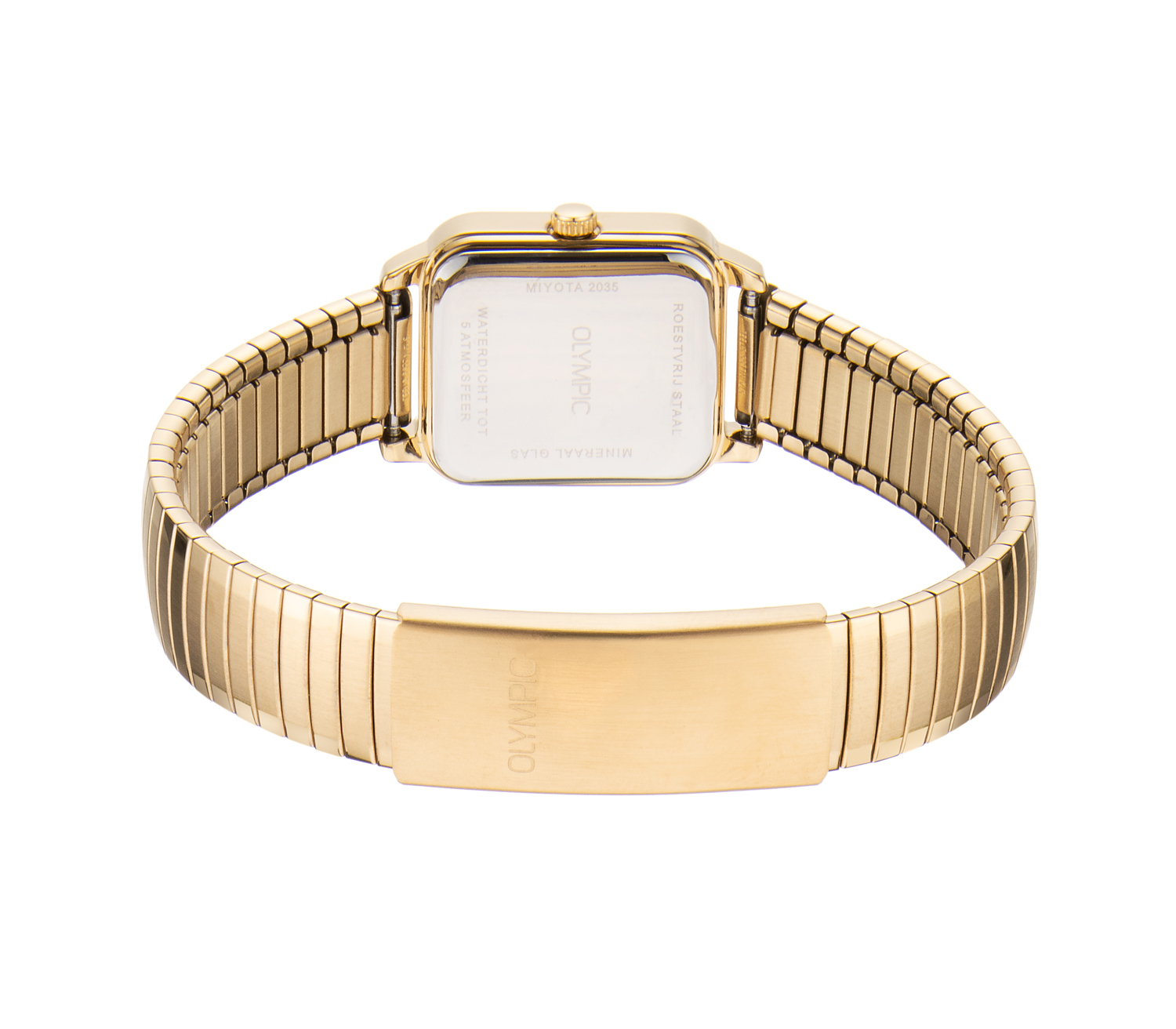 Olympic dames pols horloge staal met stalen band goudkleurig uit de Britt Collectie. 5 ATM waterdicht.