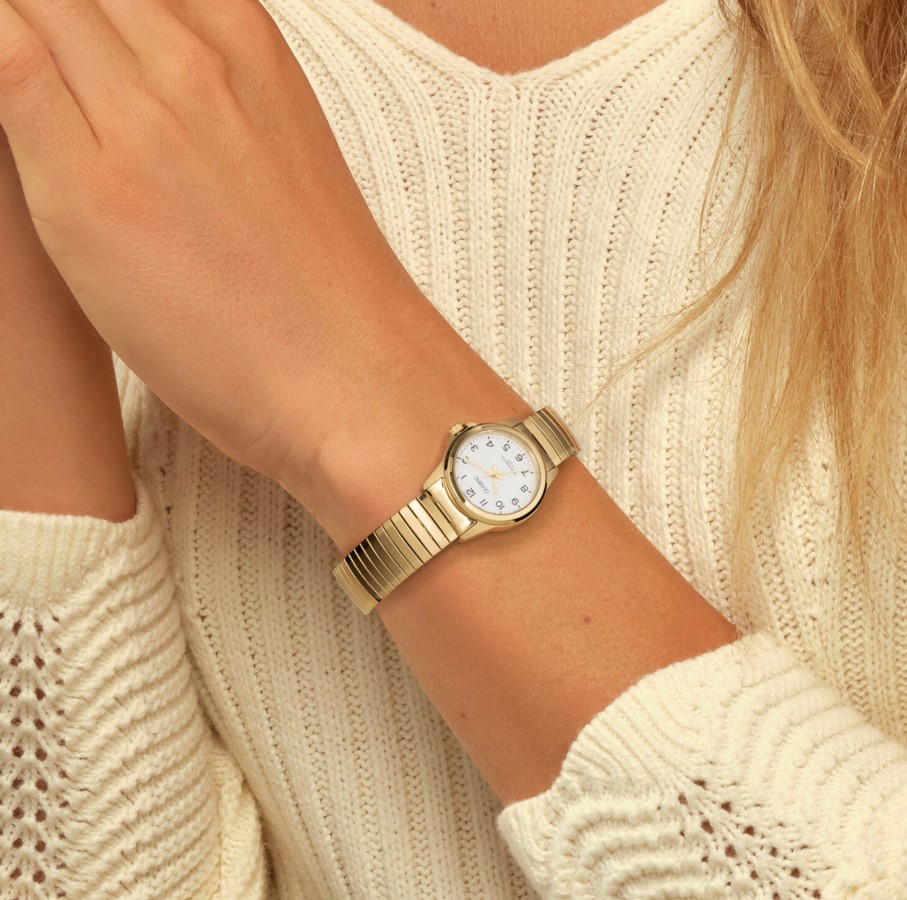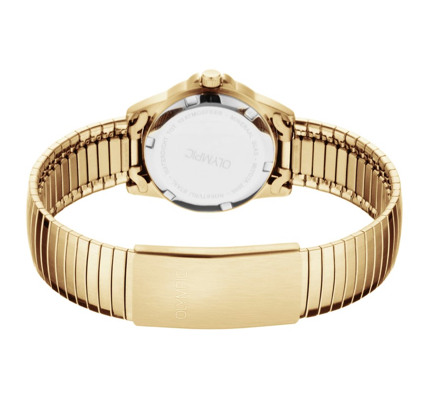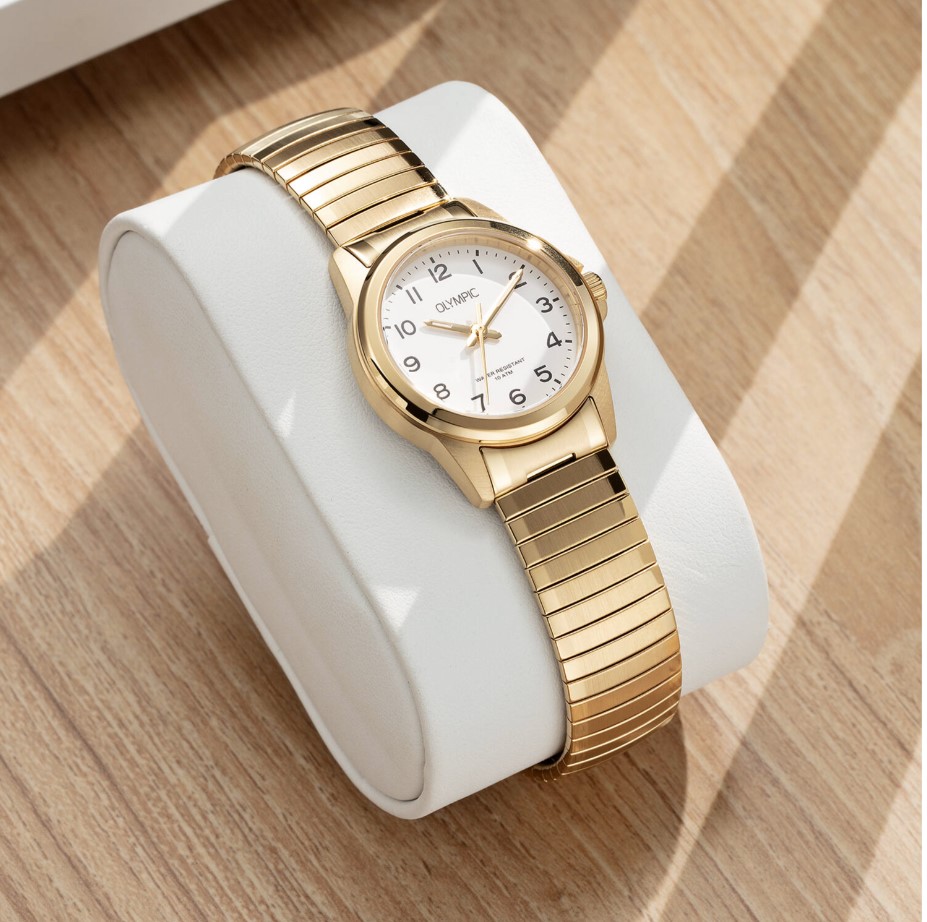 Olympic dames polshorloge edelstaal goudkleurig met een rekband en een witte wijzerplaat. 10 ATM waterdicht.