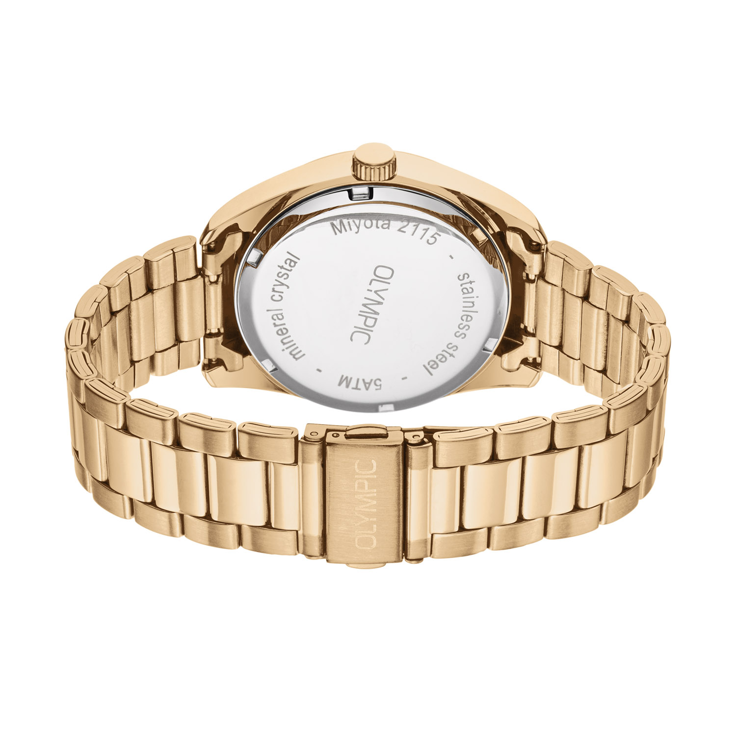 Olympic heren pols horloge edelstaal goudkleuring met schakelband en witte wijzerplaat. 5 ATM waterdicht.