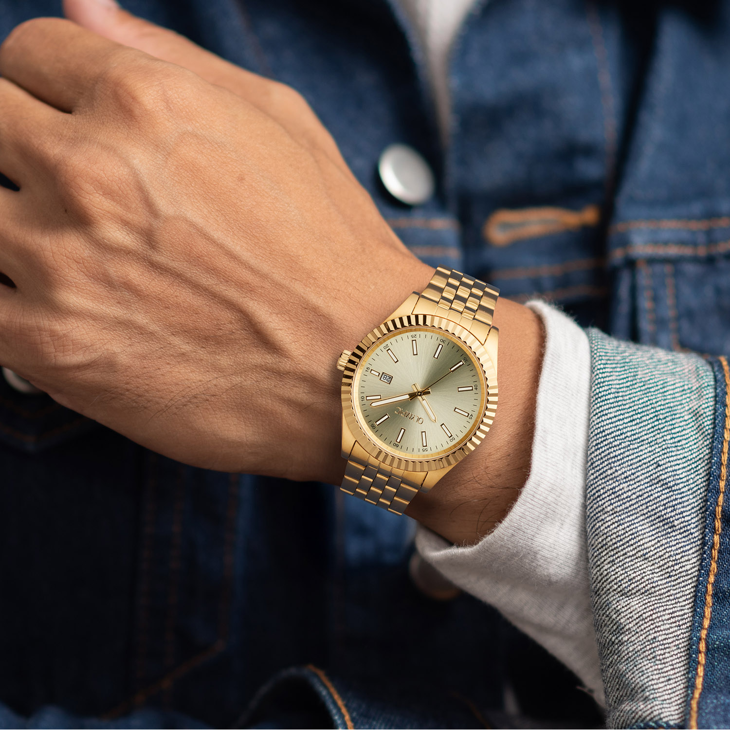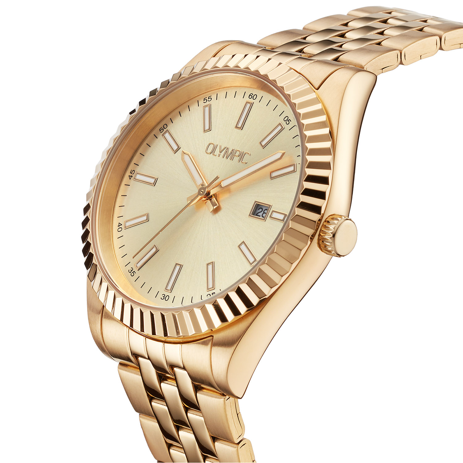 Olympic heren pols horloge staal met stalen band goudkleurig uit de Novi Collectie. 5 ATM waterdicht.