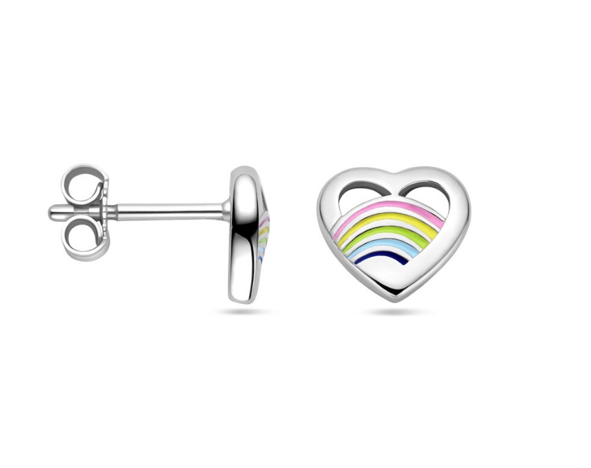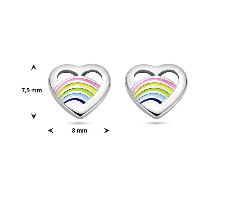 Gerhodineerd 925 zilveren oorknoppen uitgevoerd in de vorm van een hart met roze, geel, groen en blauw emaille. De oorknoppen hebben een afmeting van 7.5x8mm.