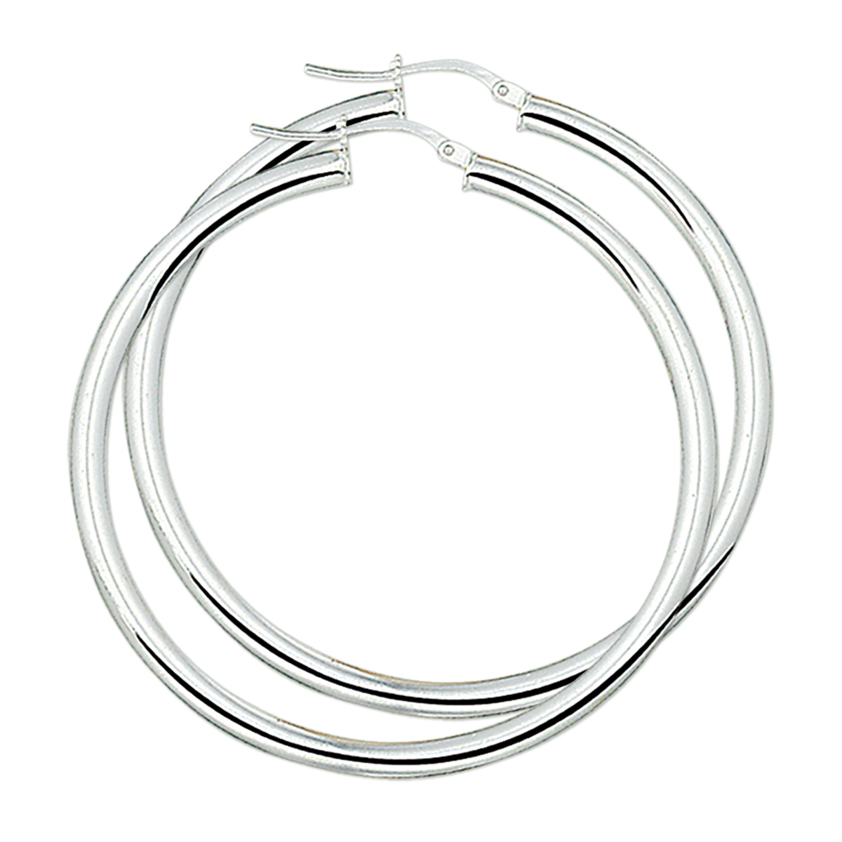 Beschrijving: Gerhodineerd zilveren creolen met een ronde buis en een hefboom-sluiting.