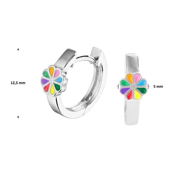 Schattige gerhodineerd zilveren oorringen met scharnier uitgevoerd met een bloem in verschillende kleuren emaille.