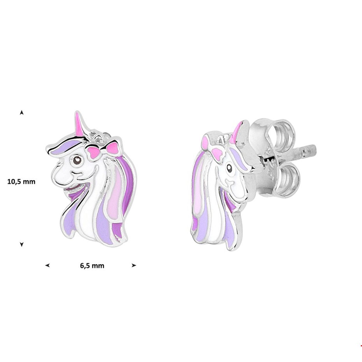 Schattige gerhodineerd zilveren fantasie eenhoorn oorknoppen met een afmeting van 10.5x6.5mm. Deze oorknoppen zijn perfect te combineren met bijpassende sieraden uit onze collectie. Tip: Leuk om kado te geven zie je ze al stralen!? Info: Gerhodineerd zilver is door de rhodiumlaag beter bestand tegen verkleuren en krassen.