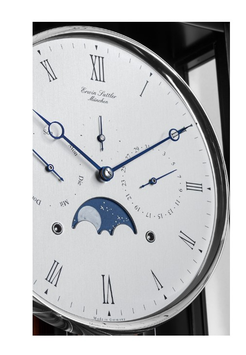 Erwin Sattler OPUS KS 100 M. Leverbaar in zwart gelakt met metaal inleg of zwart gelakt met een Macasar achterwand. Uurwerk Kaliber 1575. Loopduur 30 dagen. Metalen wijzerplaat met handbeschilderde maanstand en dag- en datum aanduiding. Uurwerk met 15 robijn lagers en 8 precisie kogellagers. Gongslag op halve en hele uren. Hand bewerkte geblauwd stalen wijzers. Slingerlens en lunette massief vernikkelt.