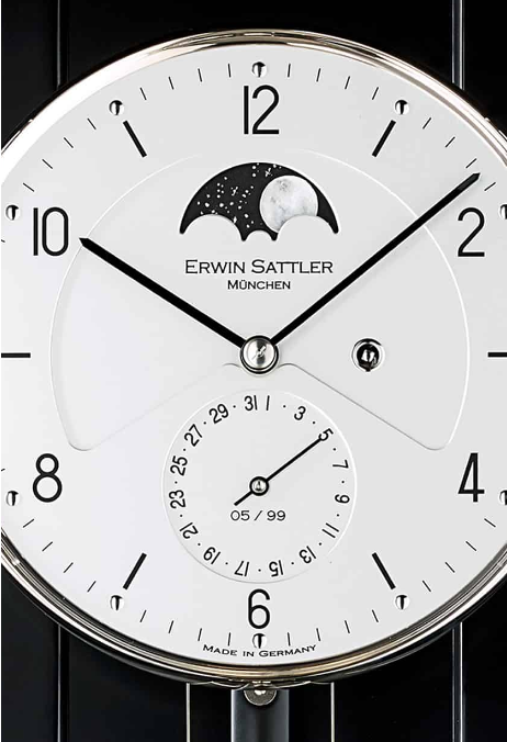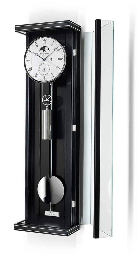 Zwart gelekte kast met metaal inleg. Kast 70 cm hoog, 20 cm breed en 10 cm diep. U-Vormig, ontspiegeld mineraal glas. Uurwerk Sattler Kaliber 1412. Loopduur 7 dagen. 2 Precisie kogellagers en  7 Robijn lagers. Geanodiseerde wijzerplaat met handbeschilderde maanschijf en datum aanduiding. Geblauwd stalen wijzers. Passage slag op rondgong.