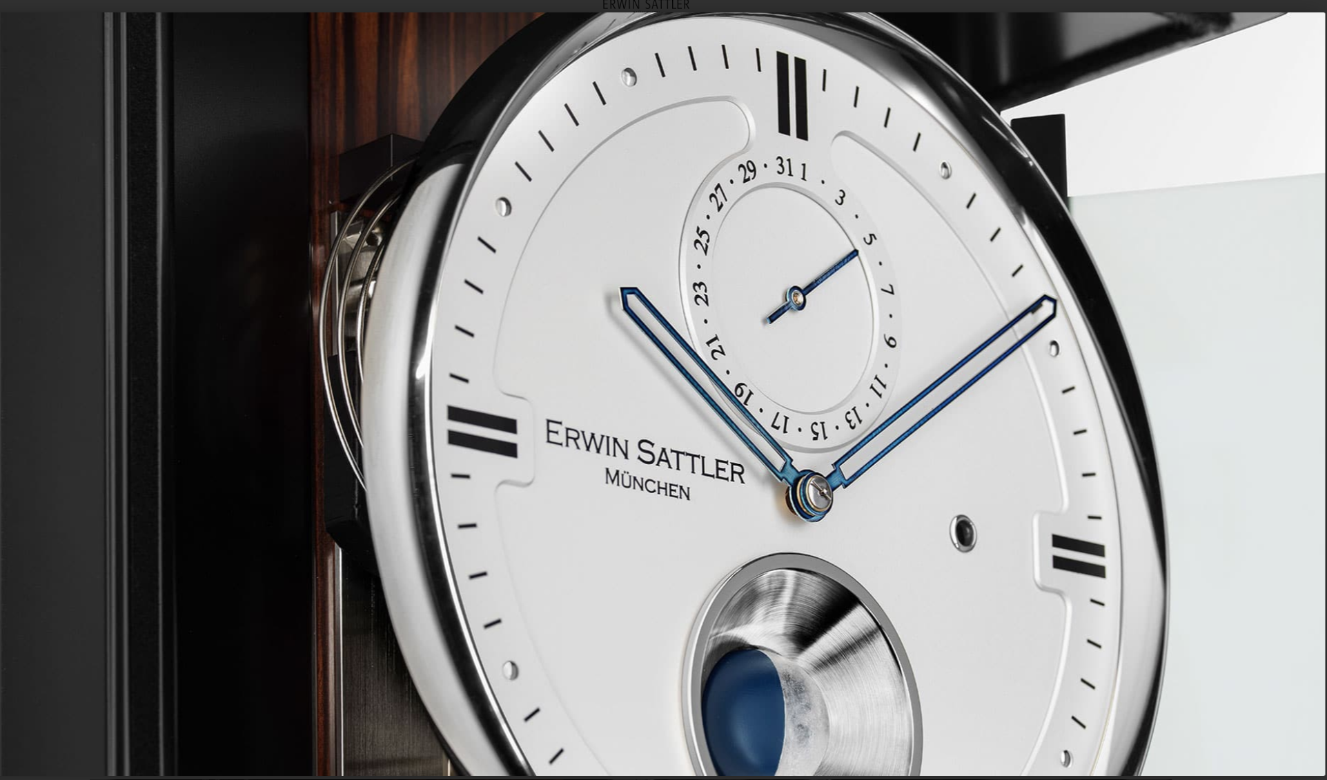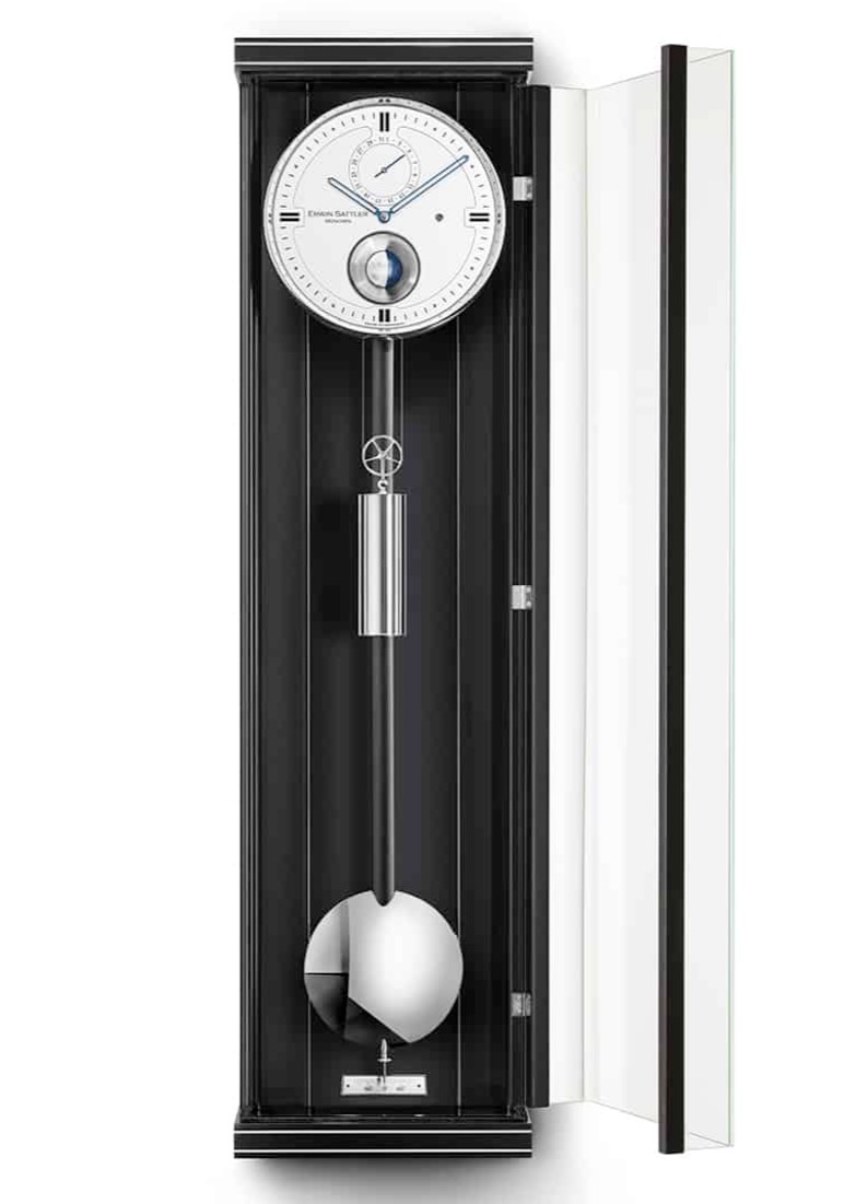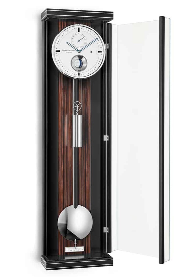 Kast leverbaar in zwart gelakt en in zwartgelakt met Makasar achterwand beide met metaal inleg. 96 cm hoog, 25,5 cm breed en 11 cm diep. Ontspiegeld mineraal glas. Uurwerk Sattler Kaliber 1577. loopduur 30 dagen. 6 Precisie edelstalen kogellagers en 8 Robijn lagers. Geanodiseerde wijzerplaat met handbeschilderde kogel maan en datum aanduiding. Passage slagwerk op rondgong.