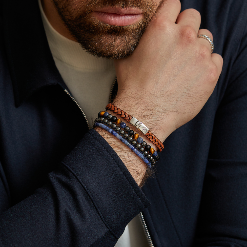 Bead armband, handgemaakt van 6mm Sodaliet, gele Tijgeroog, blauwe Tijgeroog en grijze Hematiet stenen. De sluiting is van stainless steel en de vintage look is handmatig aangebracht. Het Rebel & Rose sieraad is makkelijk te combineren met andere zilveren, leren of kralenarmbanden.