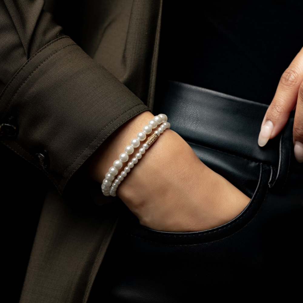 Armband gemaakt van 4mm parels (shell pearls). Shell pearls bestaan uit het parelmoer van de binnenkant van de oester. De sluiting is gemaakt van 18 karaat goud ion-plated edelstaal.