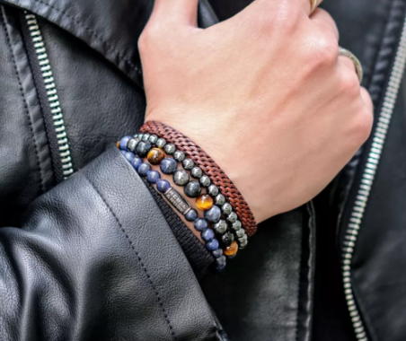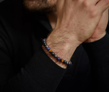Edelstenen bead armband, handgemaakt van 8mm Sodaliet, gele Tijgeroog, blauwe Tijgeroog en grijze Hematiet stenen. De sluiting is van stainless steel en de vintage look is handmatig aangebracht. Het Rebel & Rose sieraad is makkelijk te combineren met andere zilveren, leren of kralenarmbanden.
