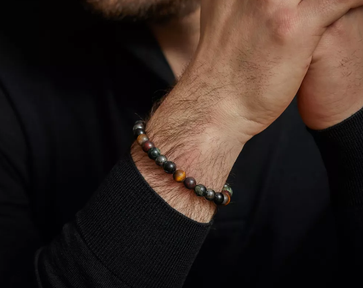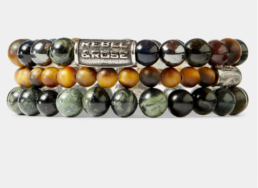 Edelsteen bead armband, handgemaakt van 8 mm Tijgeroog Blauw, Tijgeroog Geel, Brecciated Jaspis, Ryoliet en Hematiet stenen met een edelstalen sluiting. De Vintage look van de sluiting is met de hand aangebracht. De sieraden van Rebel & Rose zijn makkelijk te combineren met andere zilveren, leren of kralenarmbanden.