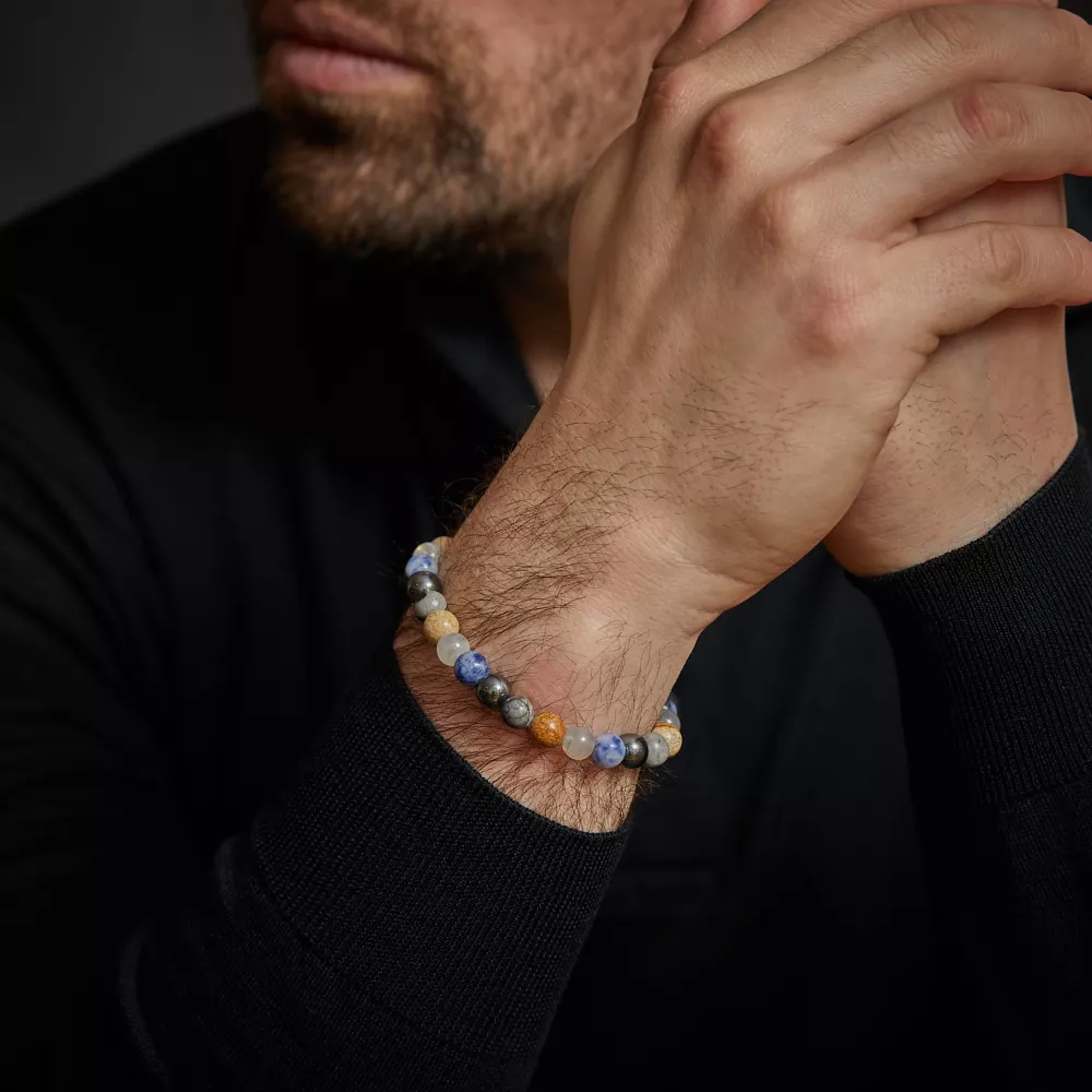 Bead armband, handgemaakt van 8mm Labradoriet, Lithografiet, Black Network, Hematiet en Blue Spot stenen met een zilverkleurig slot. Het Rebel & Rose sieraad is makkelijk te combineren met andere zilveren, leren of kralenarmbanden.