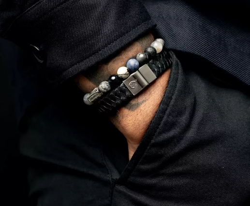 Bead armband, handgemaakt van 8mm Sodaliet Blauw, Agaat (Black Network), Tijgeroog Blauw, Larvakiet Grijs, Labradoriet en Lava stenen met een zilverkleurige sluiting. De Rebel & Rose sieraden zijn makkelijk te combineren met andere zilveren, leren of kralenarmbanden.
