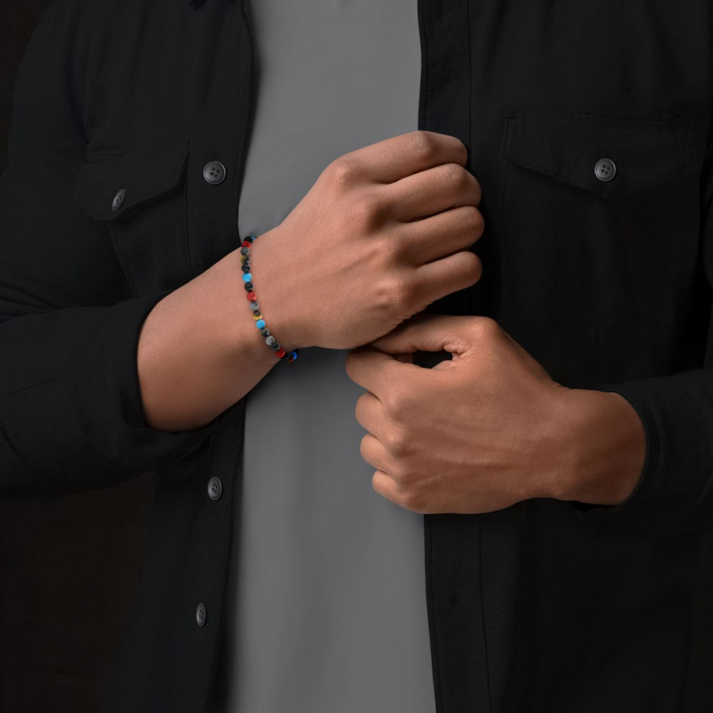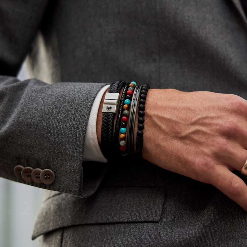 Edelstenen bead armband, handgemaakt van 6mm Turquoise, Yellow Tiger Eye, Larvikite Grey, Artificial Turquoise Red en Onyx Black stenen met een zilverkleurige sluiting. Het Rebel & Rose sieraad is makkelijk te combineren met andere zilveren, leren of kralenarmbanden.