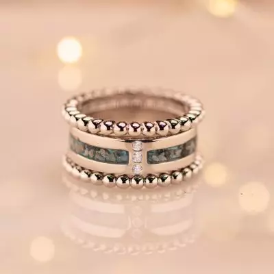 Ring met twee apart as-ruimtes en 3 zirkonia’s of diamantjes in het midden. Dit sieraad wordt zichtbaar aan de voorkant gevuld met as en wordt vermengd met onze speciale hars. Deze ring is eventueel te vullen met twee verschillende asjes.