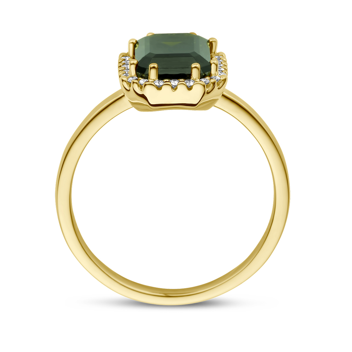 14 Karaat geelgouden ring uitgevoerd met toermalijn en 0.10 caraat diamant H/SI. De ring heeft een breedte van 10.5mm.
