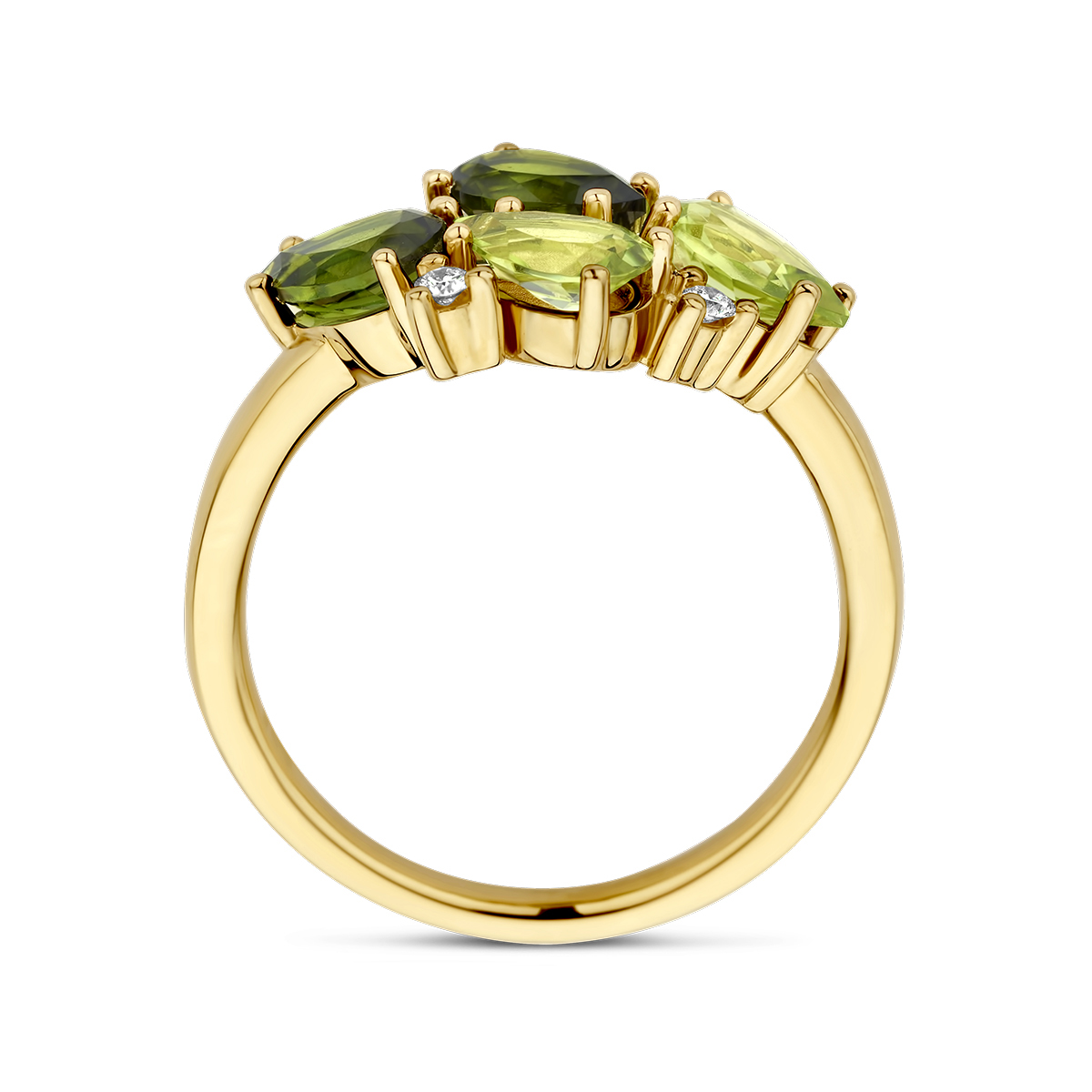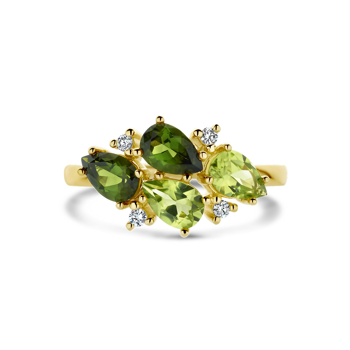14 Karaat geel gouden dames fantasie ring, Vintage stijl met daarin groene toermalijn, peridot en 0.06 crt H/SI briljant. Ring voor de liefhebben van verfijndende elegantie.