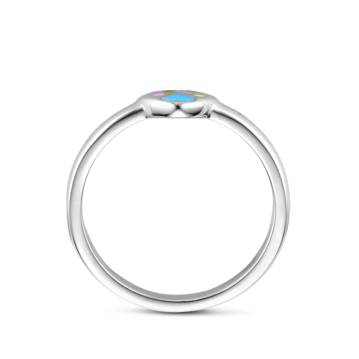 Gerhodineerd 925 zilveren ring uitgevoerd in de vorm van een hartje met hondenpoten. De ring heeft een afmeting van 5x6mm.