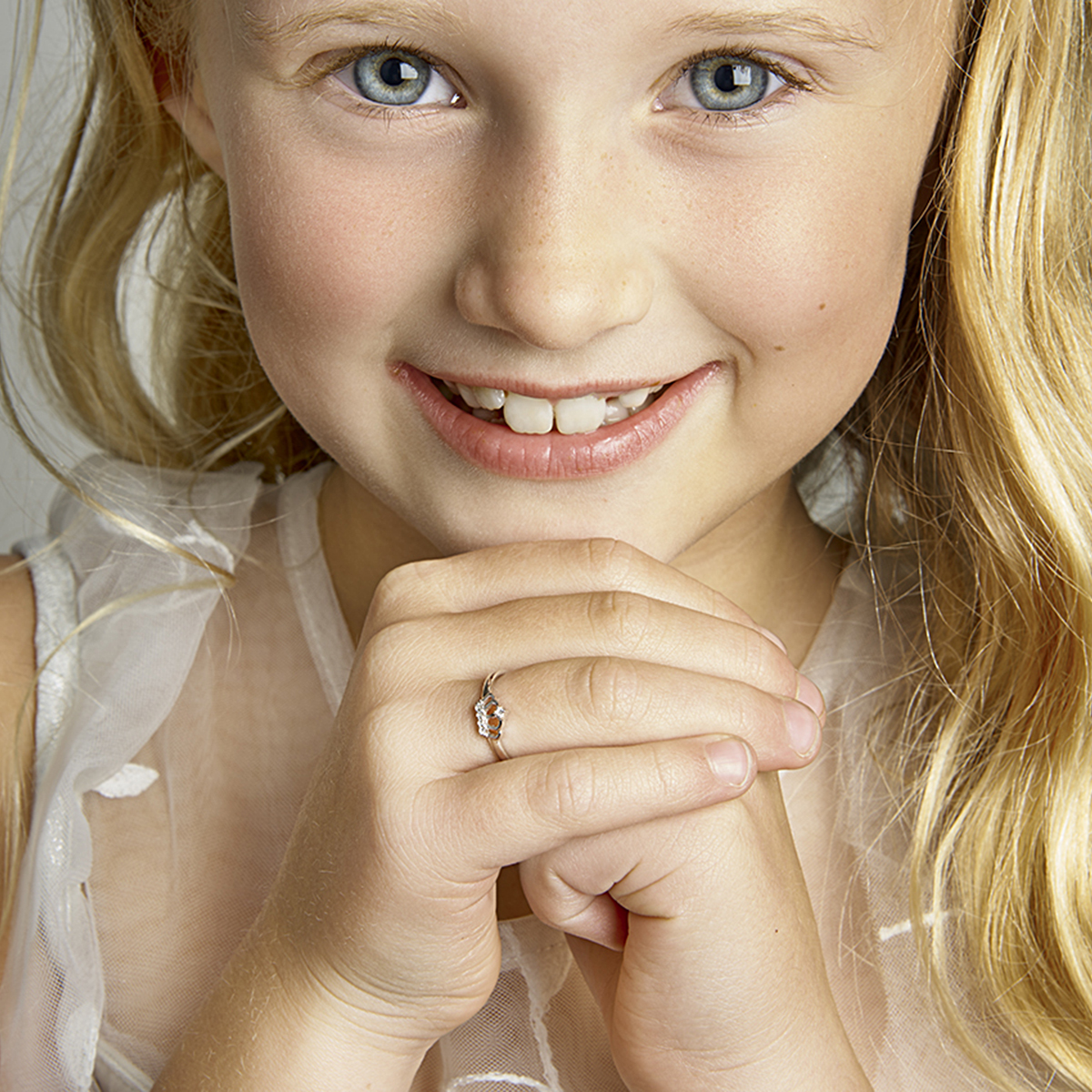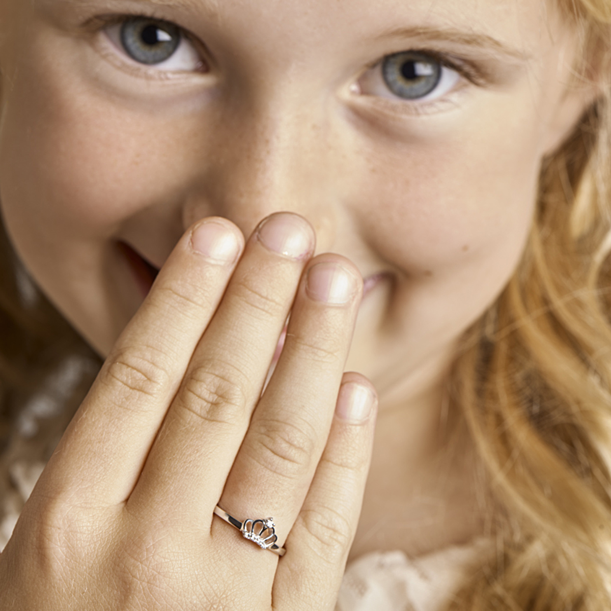 Schattige gerhodineerd zilveren kroontjes ring met een breedte van 6mm. Uitgevoerd met schitterende zirkonia. Deze ring is perfect te combineren met bijpassende sieraden uit onze collectie. Tip: Leuk om kado te geven! Info: Gerhodineerd zilver is door de rhodiumlaag beter bestand tegen verkleuren en krassen.