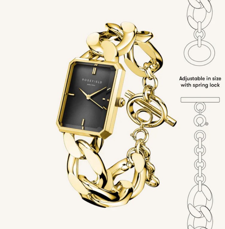 Ontdek Rosefield Studio: een collectie van uitgesproken items met een extra premium uitstraling. Het nieuwste RF Studio item is een twist op het klassieke Octagon horloge, maar dan in een kleiner XS formaat. De horlogeband, een luxe gepolijste platte kinketting, maakt van dit klokje bijna een sieraad. Je kunt het formaat van de ketting aanpassen om hem passend te maken en hem sluiten door de T-bar door de O-ring te vergrendelen.