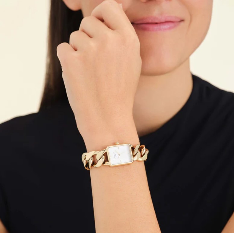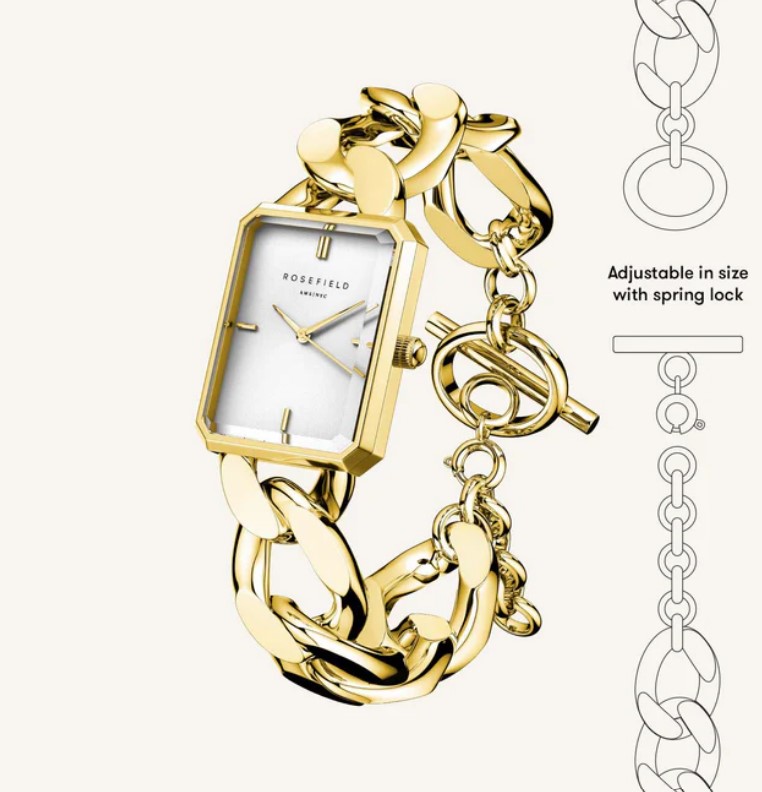 Ontdek Rosefield Studio: een collectie van uitgesproken items met een extra premium uitstraling. Het nieuwste RF Studio item is een twist op het klassieke Octagon horloge, maar dan in een kleiner XS formaat. De horlogeband, een luxe gepolijste platte kinketting, maakt van dit klokje bijna een sieraad. Je kunt het formaat van de ketting aanpassen om hem passend te maken en hem sluiten door de T-bar door de O-ring te vergrendelen.