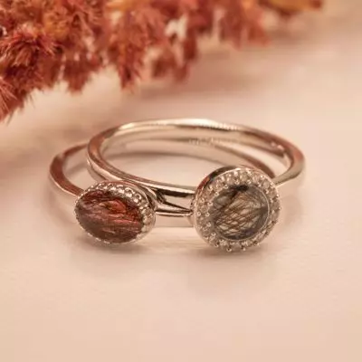 Ring met zirkonia of diamant. Dit sieraad wordt zichtbaar aan de voorkant gevuld met as en wordt vermengd met onze speciale hars. Het ronde compartiment zit boven op de scheen gemonteerd, waardoor deze ring ook goed te combineren is met andere ringen en de kop hier mooi overheen geplaatst kan worden. Hierdoor sluiten de ringen perfect aan elkaar aan.