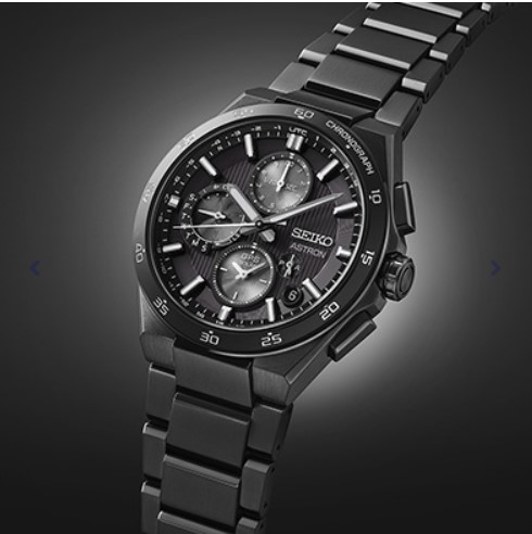Seiko Astron model SSH155J1 met Kaliber 5X83. Hoogwaardige zwarte Titanium kast en zwarte Titanium band met vouwsluiting. GPS gestuurd Solar horloge met stopwatch functie. Energiereserve ca 6 maanden. Ontspiegeld Saffier glas. 10 ATM waterdicht.