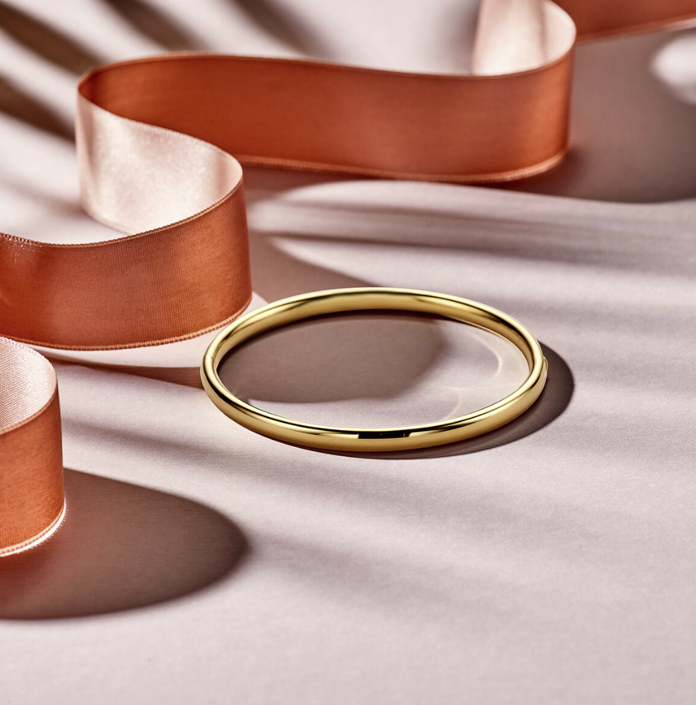 Silgold Bangle. Silgold sieraden van 14 karaat goud met daarin een kern van 925 zilver. Geelgouden bangle ovale buis met scharnier-sluiting. 3x 61 mm.