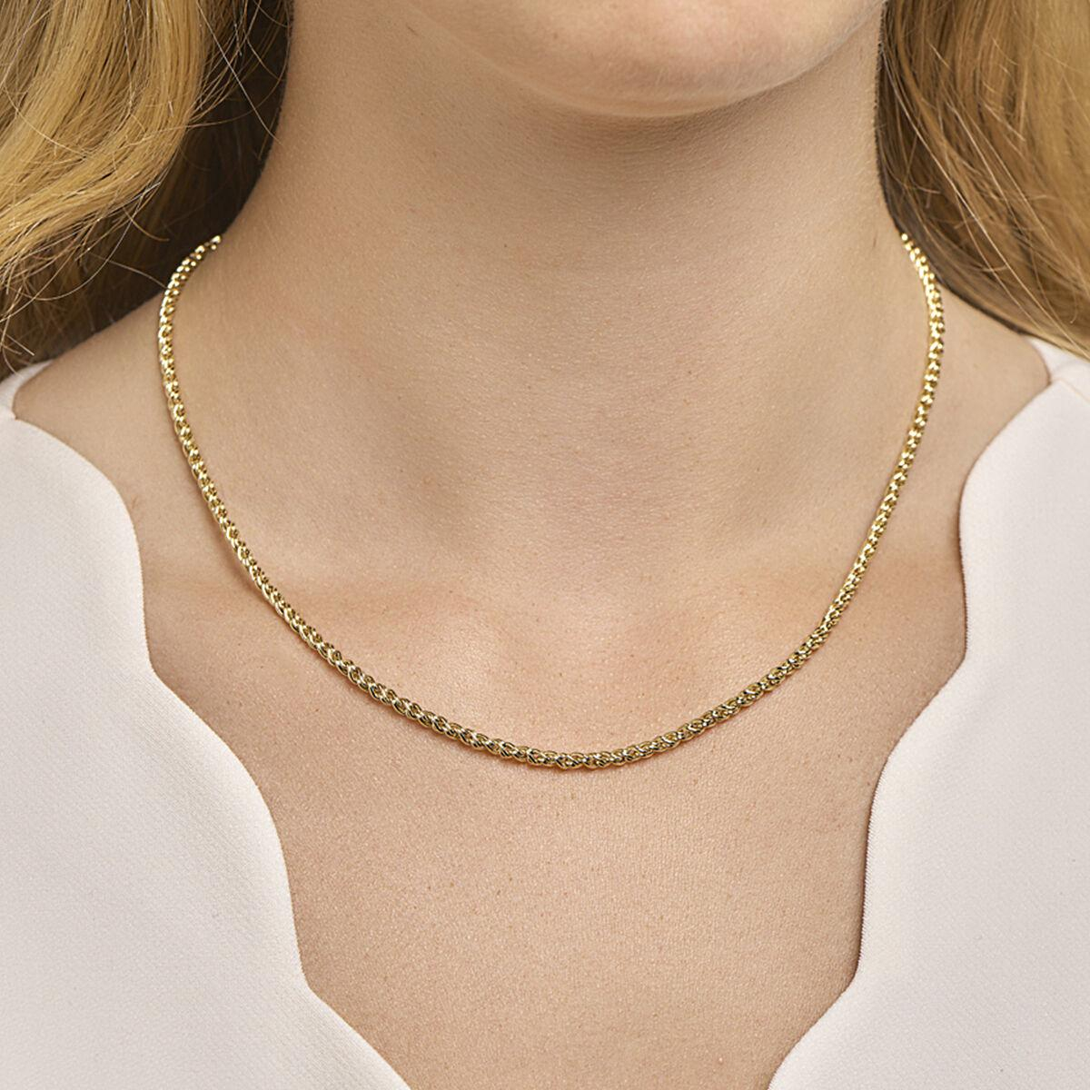 14 karaat gouden collier met 925 zilveren kern.  Spiga koord 45 cm lang geelgoud. Schakel 5 mm breed met karabijnhaak sluiting.