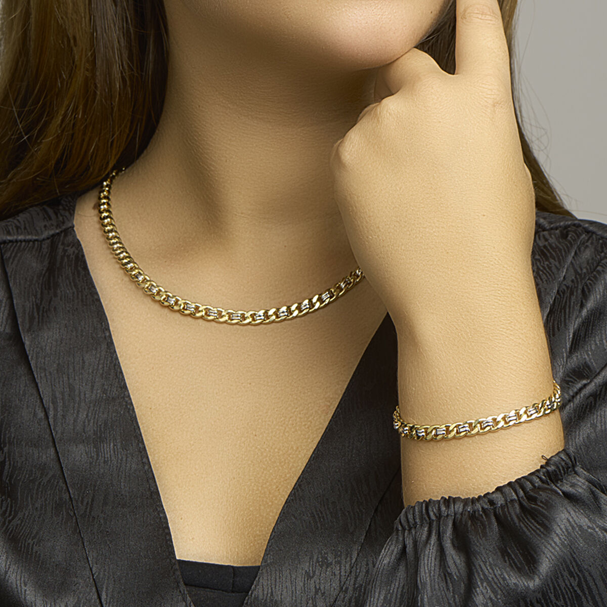 ZilGold 14 karaat goud met daarin een kern van 925 zilver. Bicolor wit- en geelgouden collier met gourmette schakel. 50 cm lang. Schakelbreedte is 6,2 mm. Met Karabijnhaak sluiting.