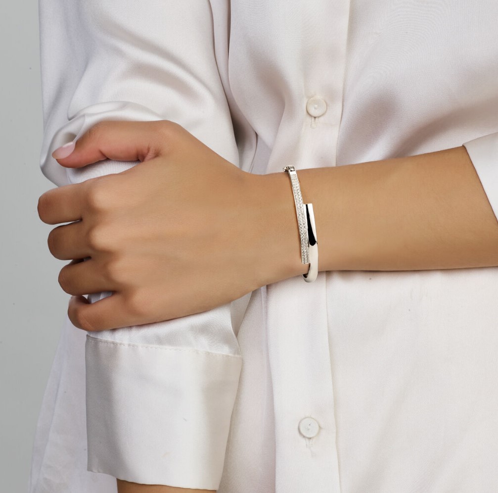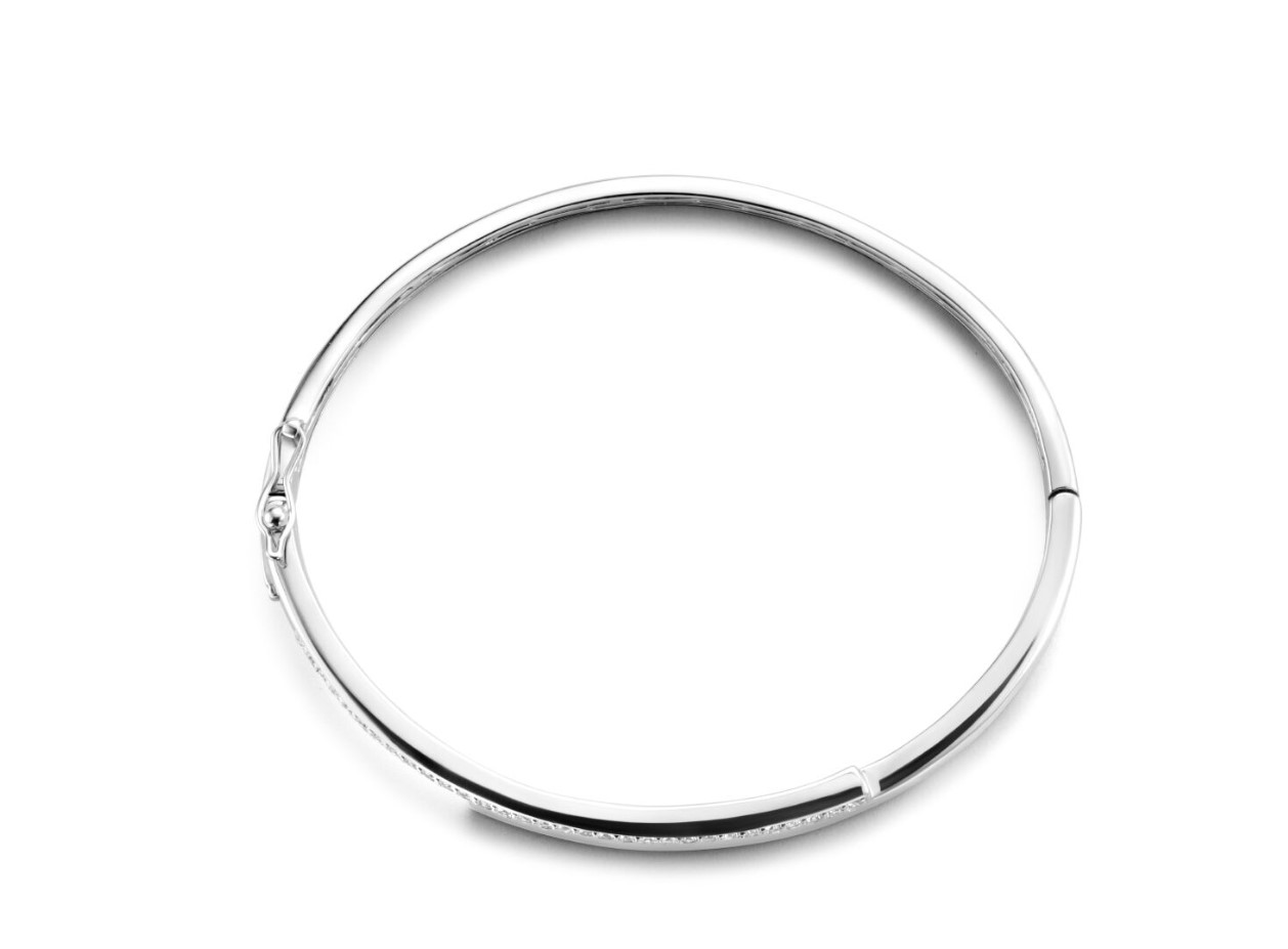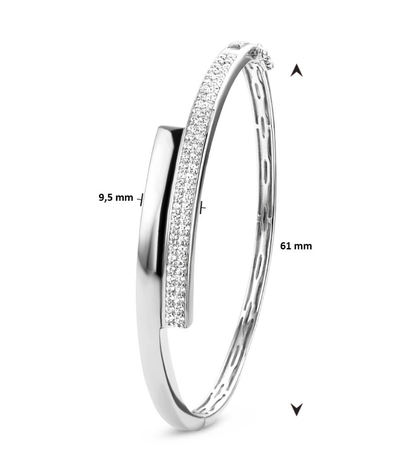 Gerhodineerd 925 zilveren bangle uitgevoerd met een schitterend zirkonia vlak. De bangle heeft een diameter van 61mm en een breedte van 9.5mm.
