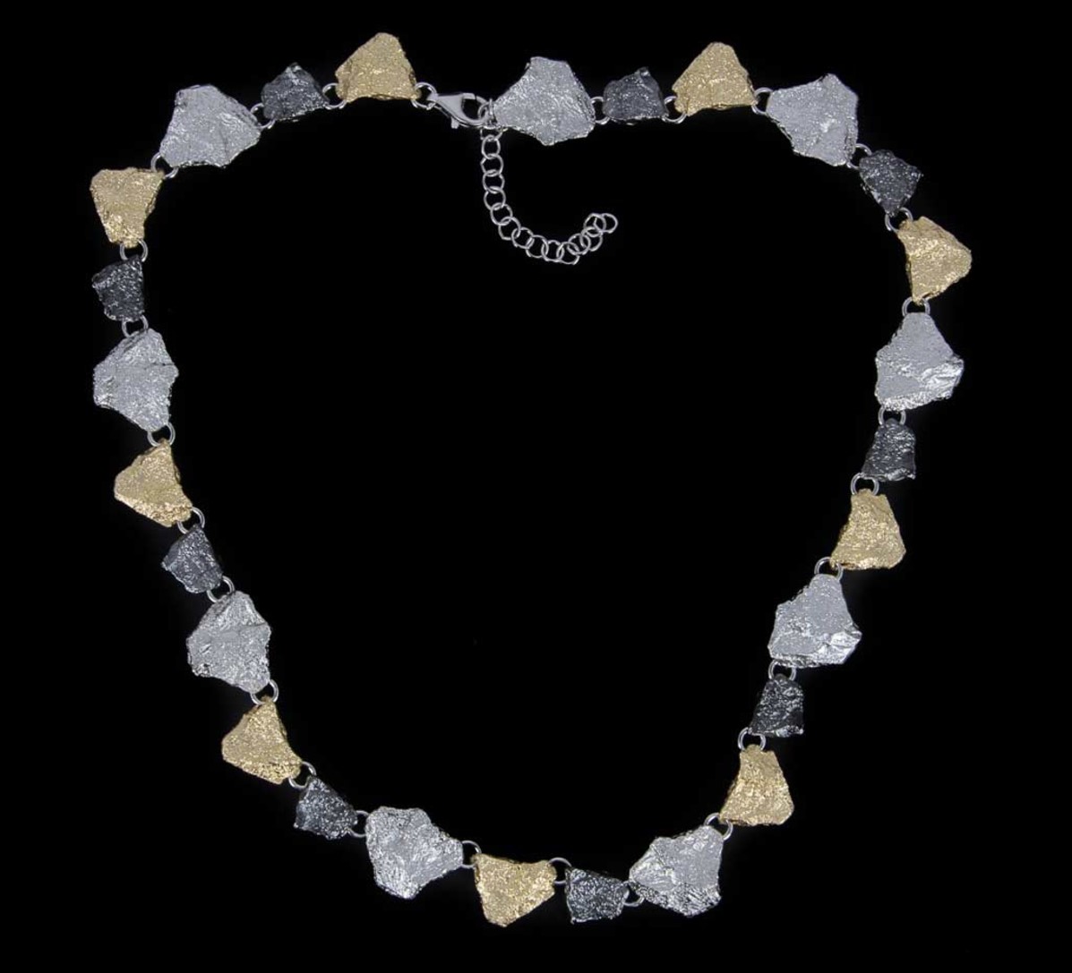 Bijzondere driekleurige ketting van 925 sterling zilver bestaande uit steenvormige hangertjes die op een ketting aan elkaar verbonden zijn.
