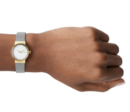 Skagen dames polshorloge staal met stalen band bicolor. collectie Freja Lille. 5 ATM waterdicht.