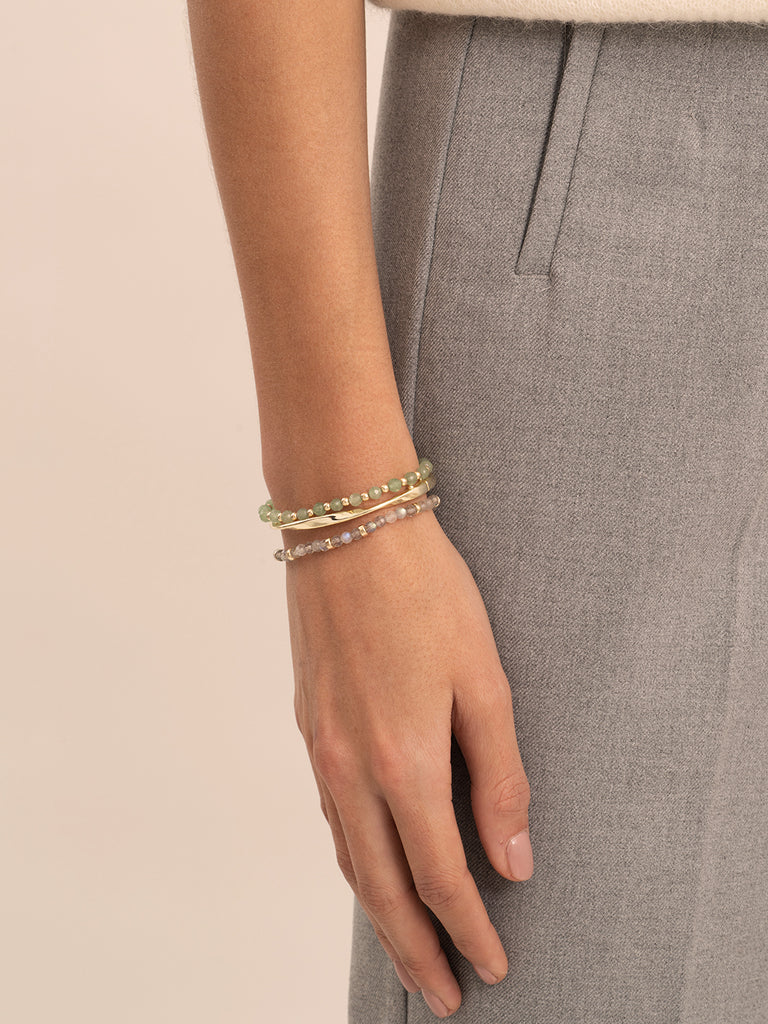 De Labradorite Roundel Interstellar armband is een echte eyecatcher. Met zijn verfijnde ontwerp is dit sieraad perfect om te dragen als statement piece, maar ook ideaal om te combineren in een stijlvolle stack met andere Labradorite- of gouden armbanden.