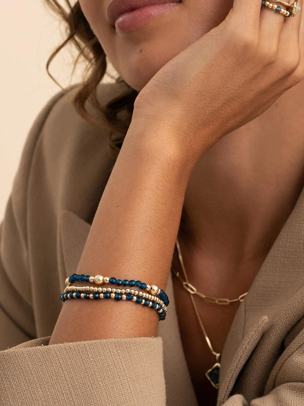 De Bold Mix Armband Ocean Topaz Quartz is ontworpen voor vrouwen die durven te stralen. De blauwe edelstenen vormen samen met de goudkleurige kralen een levendig kleurenspel, dat perfect contrasteert met de stevige schakels van de armband. Ze voelt robuust aan, maar draagt soepel en comfortabel. Of je haar nu combineert met pasteltinten of neutrale outfits – deze armband geeft je stijl altijd een frisse, uitgesproken uitstraling. Voor wie graag laat zien wie ze is, zonder iets te zeggen.