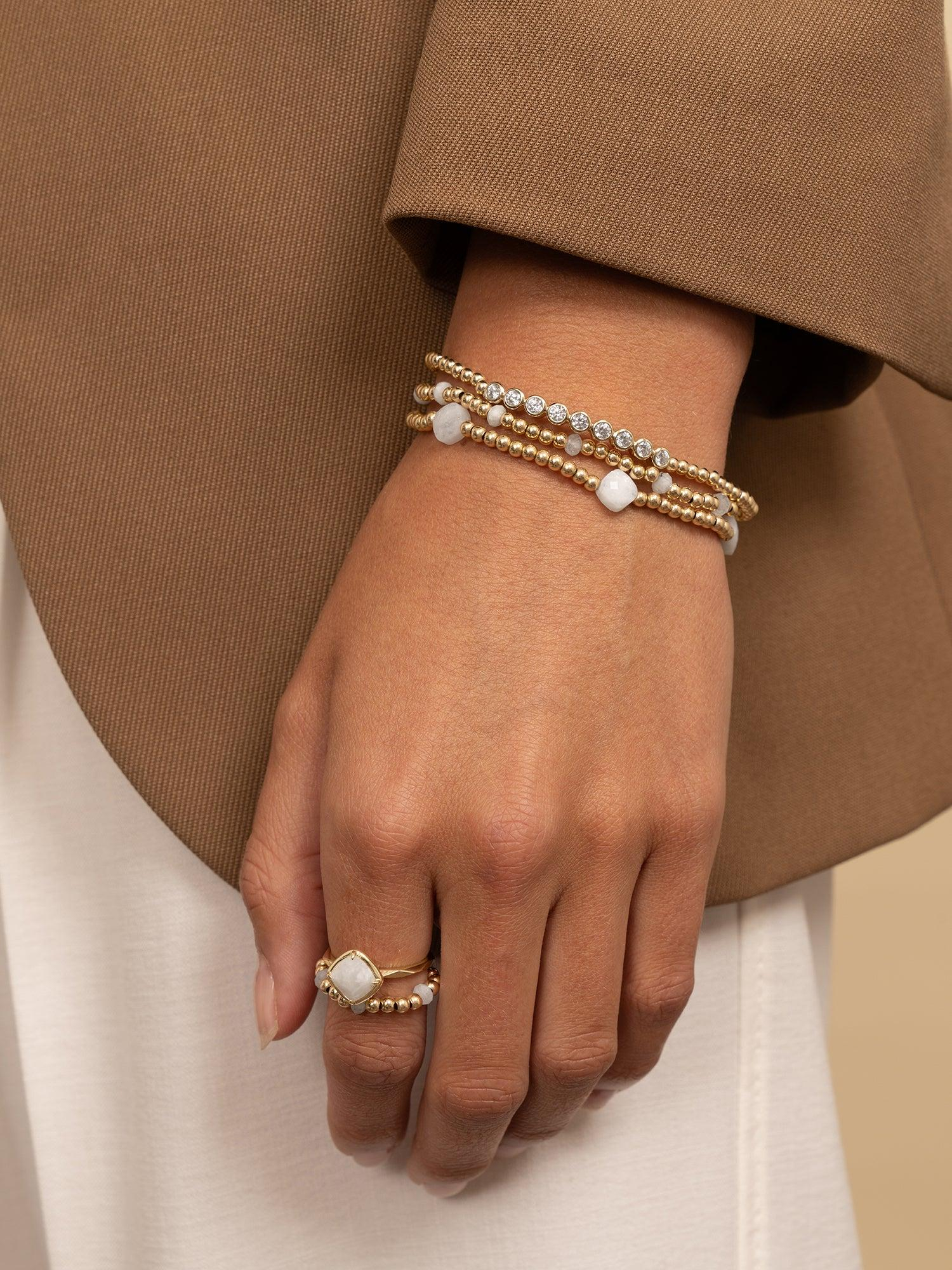 Reverse Roundel Armband Moonstone Goud Kleurig. Deze armband brengt warmte en sereniteit in balans. De goudkleurige afwerking geeft een zachte gloed, terwijl moonstone het licht diffuus vangt. De ronde tussenstukken bewegen mee en zorgen voor een subtiele schittering bij elke stap. Draag naast een bangle of horloge voor een moderne mix. Combineer met lichte tinten voor een rustige uitstraling of geef donkere outfits een verfijnde lift. De afwerking voelt glad en blijft comfortabel, van ochtend tot avond. Een elegant ontwerp dat je sieradencollectie verrijkt met een stralend, tijdloos accent.